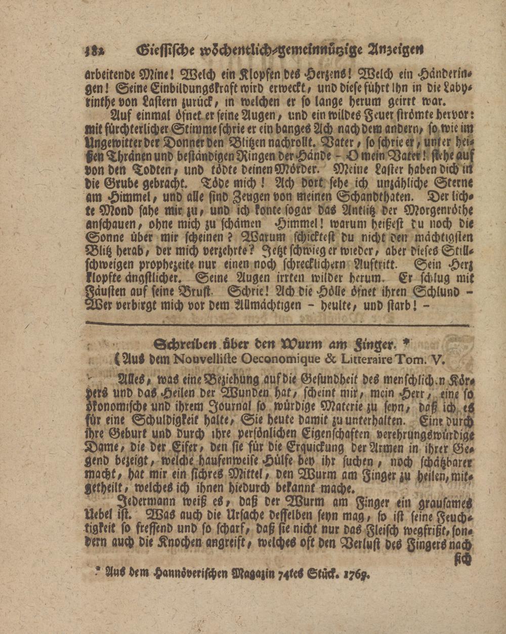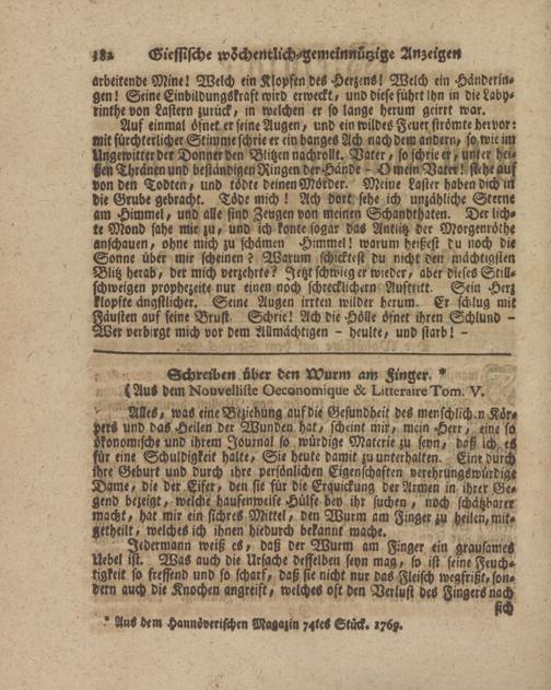 Alles, was eine Beziehung aufdie Gesundheit des menschlich.n Körpers und daS Heilen der Wunden hat, scheint mir, mein Herr, eine so ökonomische und ihrem Journal so würdige Materie zu seyn, daß ich eS für eine Schuldigkeit halte, Sie heute damit zu unterhalten. Einr durch ihre Geburt und durch ihre persönlichen Eigenschaften verehrungswürdig- Dame, die der Eifer, den sie für die Erquickung der Armen in ihrer Gegend bezeigt, welche haufenweise Hülfe bey ihr suchen , noch schätzbarer macht, hat mir ein sichres Mttek, den Wurm am Finger zu heilen,mit- -etheilt, welches ich ihnen hiedurch bekannt mache.