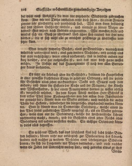 Cs fehlt ein Lehrbuch über die Geschichte, darinnen die Hauptsachen in einer gewissen fruchtbaren Kürze, in gehöriger Ordnung, erst die politische Geschichte eines jeden merkwürdigen Volks und Staats nach dem andern, und dann die Historie der Kirche und der Religion, der Künste und Wissenschaften, so viel einem Frauenzimmer hiervon zu wissen nöthig ist, vorgestellt würden. An dem kurzen Abriß welchen Herr Schröck in dem ersten Theil feiner Kirchengeschichts von den ersten drey Jahrhunderten gemacht hat, könnte man ein Muster absehen, nach welchen Vie andre Theile der Historie, insonderheit die bürgerliche, abgehandelt werden könnten. Eben so könnte man die Cramerische Einleitung, welche einem jeden Theil dieses unsterblichen Werks vorgesetzt ist, als ein Muster gebrauchen , wenn man nur die Verbindung, welche die synchronistische Lehrart nothwendig macht, trennte, und die Geschichte eines jeden Reichs ohne Verbindung mir andern vorsteüen wollte. Ein mäßiger Octavband könnte dieses alles begreiffen.