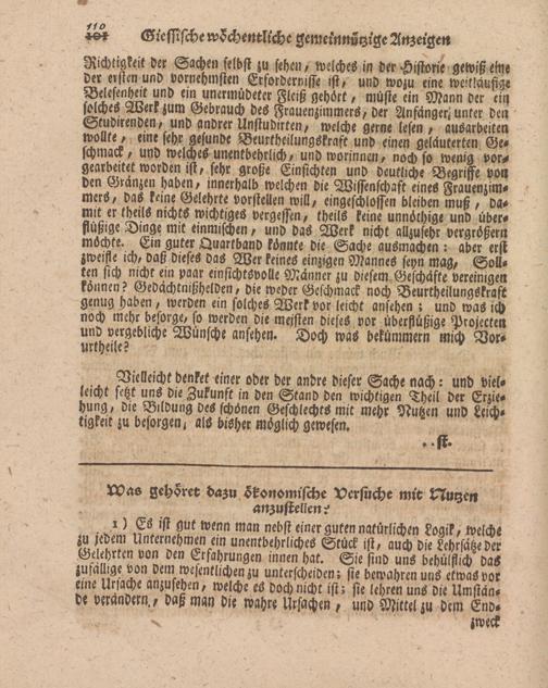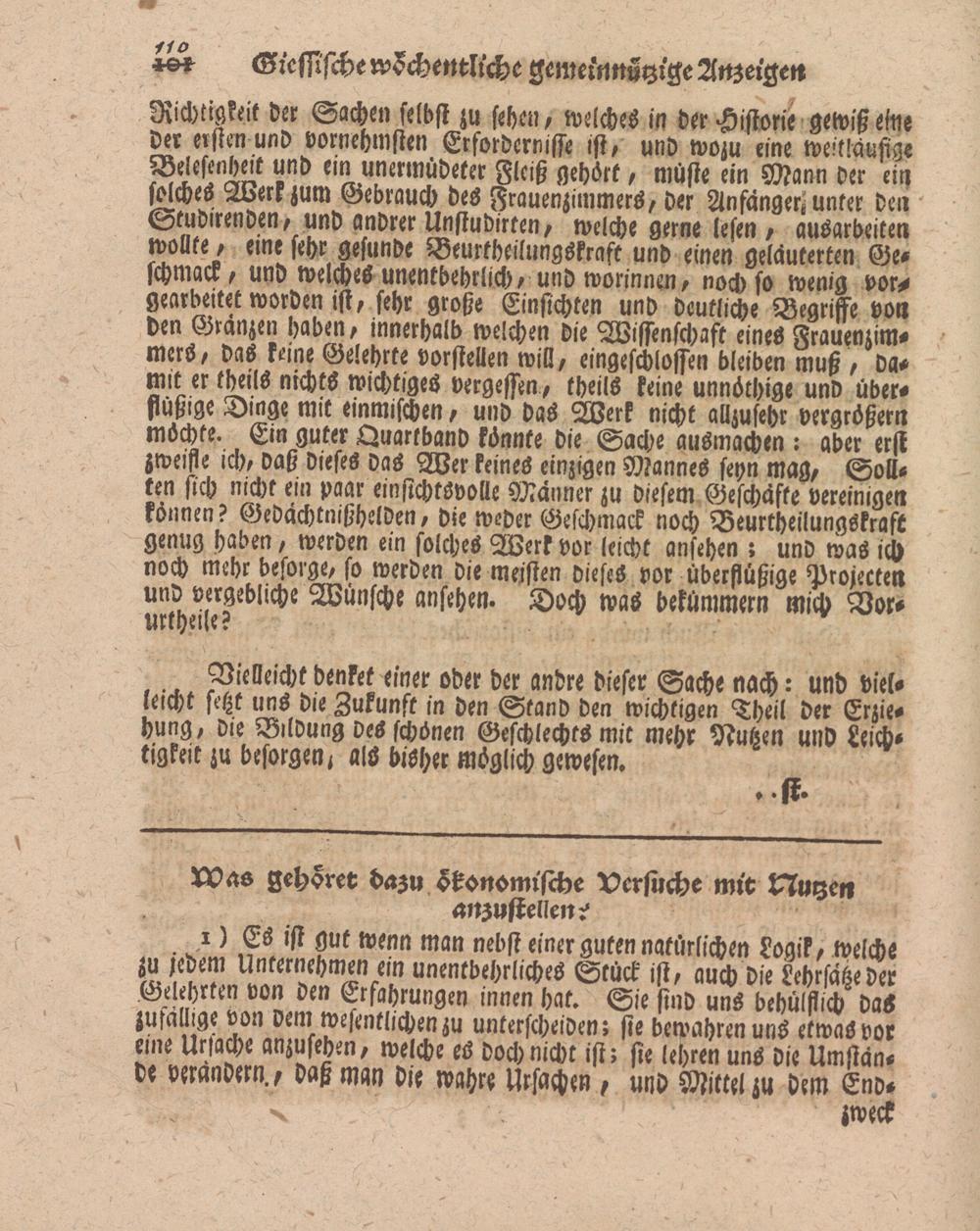 Vielleicht denket einer oder der andre dieser Sache nach: und viel- uns die Zukunft in den Stand den wichtigen Theil der Erziehung, die Bildung des schönen Geschlechts mit mehr Nutzen und Leichtigkeit zu besorgen { als bisher möglich gewesen.