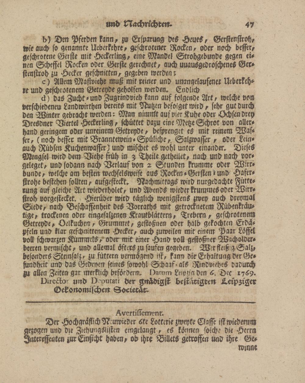 d) das Zucht-und Zugrindvieh kann auf folgende Art, welche von verschiedenen Landwirthen bereits mit Nutzen befolget wird , sehr gut durch den Winter gebracht werden: Man nimnlt auf vier Kühe oder -Ochsen drey Dresdner Viertel Heckerling, schüttet dazu eine Metze Schrot von aller# band geringem oder unreinem Getreyde, besprenget es mit reinem Wasser, (noch besser mitBranntewein-Spüsiche, Salzwasser, oder Lein# auch Rübsen Kuchenwasser) und mischet es wohl unter einander. Dieses Mngsel wird dem Viehe früh in 3 Theile getheilet, nach und nach vor# geleget, und sodann nach Verlauf von 2 Stunden krumme oder Wirrbunde, welche am besten wechselsweise aus Rocken-Gersten »und Haferstrohe bestehen sollten, aufgesteckk. Nachmittags wird nurgedachte Fütterung auf gleiche Art wiederholet, und Abends wieder krummes oder Wirr# stroh vorgestecket. Hierüber wird täglich wenigstens zwey auch dreymal Siede, nach Beschaffenheit des Vorraths mit getrocknetem Rübenkräu- rige, trockenen oder eingesaszenen Krautblättern, Trebern, geschrotenem Getreyde, Oelkuchen, Grlmrmet, gestoßnen oder halb gekochten Erdäpfeln und klar geschnittenem Hecker, auch zuweiten mit einem Paar Löffel voll schwarzen Kummetsoder mit einer Hand Volk gestoßner Wacholderbeeren vermischt, und allemal öfters zu saufen gegeben. Wer ffeißgSalz, besonders Steinsalz, zu füttern vermögend ist, kann die Erhaikung der Gesundheit und das Gedeon seines sowohl Schaaf> als Rindviehes dadurch zu alten Zeiten gar merklich befördern. Darum Leipzig den 6 Dec 17 £9.