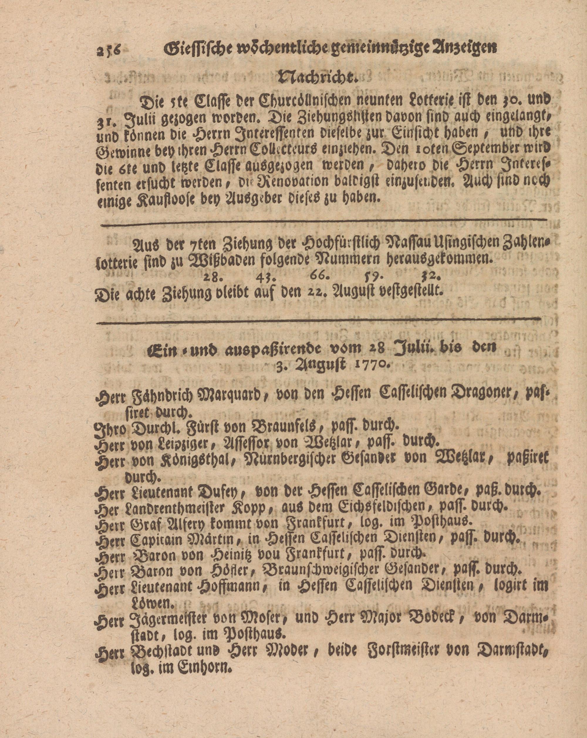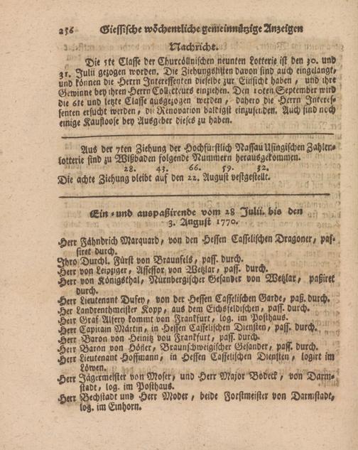 Ein - und auspaßirende vom 28 Julü. bis den 3. Angust 1770.