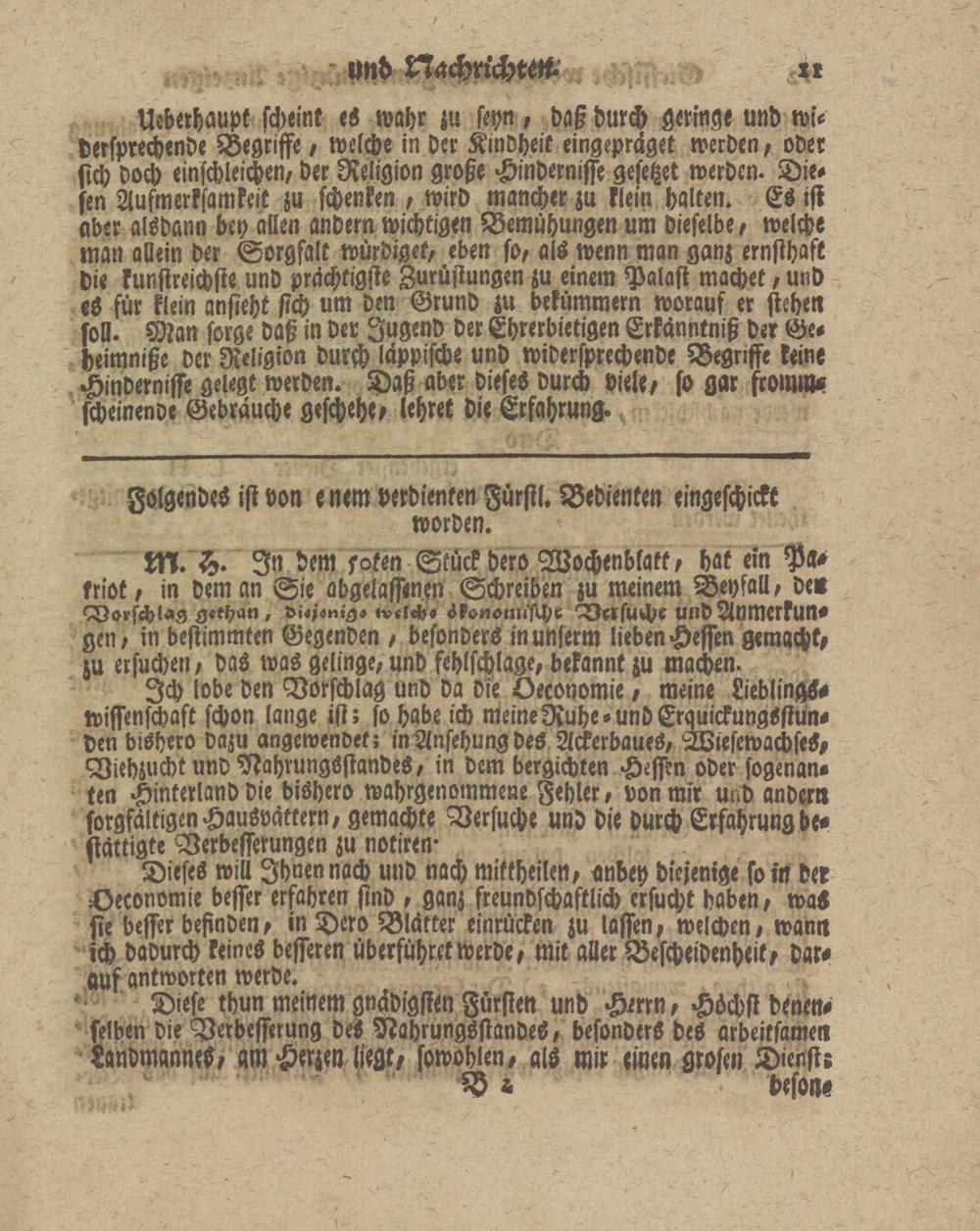 Ich lobe den Vorschlag und da die Oeconomie, meine LieblingS- wiffenschaft schon lange ist; so habe ich meine Ruhe-und Erquickungsstun- den bishero dazu angewendek; in Ansehung des Ackerbaues, WiesewachseS, Viehzucht und Nahrungsstandes, in dem verzichten Hessen oder sogenan« ten Hinterland die bishero wahrgenommene Fehler, von mir und ander« sorgfältigen Hausvättern, gemachte Versuche und die durch Erfahrung be- siättigte Verbesserungen zu notiren-