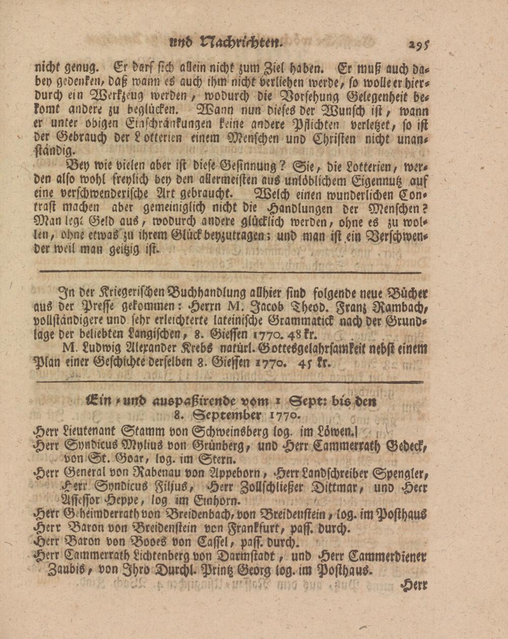 In der Kriegerischen Buchhandlung allhier sind folgende neue Bücher aus der Presse gekommen: Herrn M. Jacob Theod. Franz Rambach, vollständigere und sehr erleichterte lateinische Grammatick nach der Grundlage der beliebten Langischen, 8. Giessen 1770.48 fr.