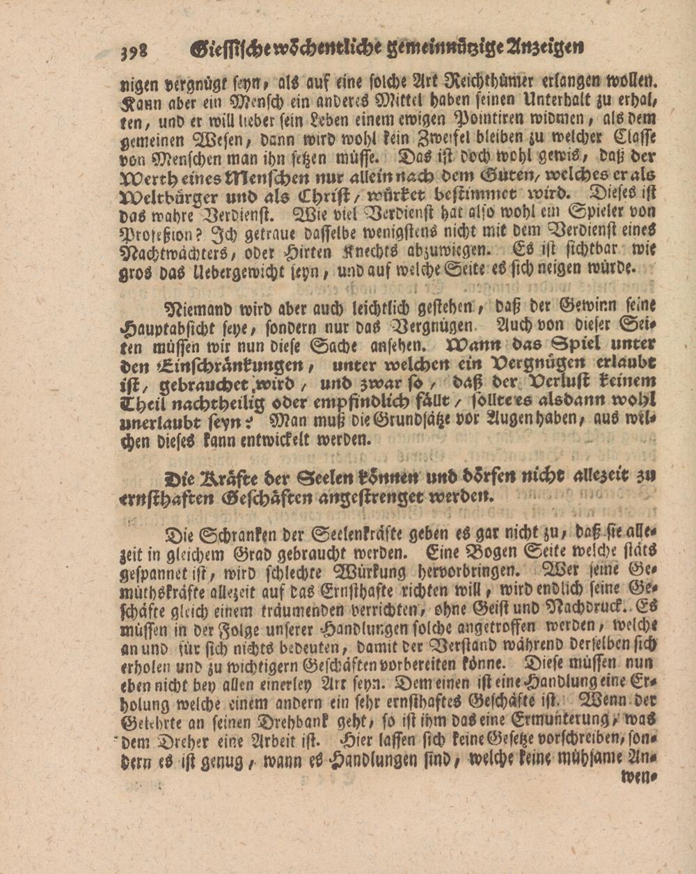 Digen vergnügt seyn, als auf eine solche Art Reichthümrr erlangen wollen. Kann aber ein Mensch ein anderes Mittel haben seinen Unterkalt zu erhal, ren, und er will lieber fein Leden einem ewigen Pointiren widmen, als dem ^meinen Wesen, dann wird wohl lein Zweifel bleiben zu welcher Ciasse von Menschen man ihn setzen müsse. DaS ist doch wohl genns, daß der wcrrh eines Menschen nur allein nerch dem Gutem welches er als Weltbürger und als Christ / würket bestimmet wird. Dieses ist Vas wahre Verdienst. Wre viel Verdienst hat also wohl cm Spieler von Prvteßion? Ich getraue dasselbe wenigstens nicht mit Dem Verdienst eines Nachtwächters, ober Hirten Knechts adzuwiegen. Es ist sichtbar wie gros das Uedergewicht seyn, und auf welche Seite es sich neigen würde.