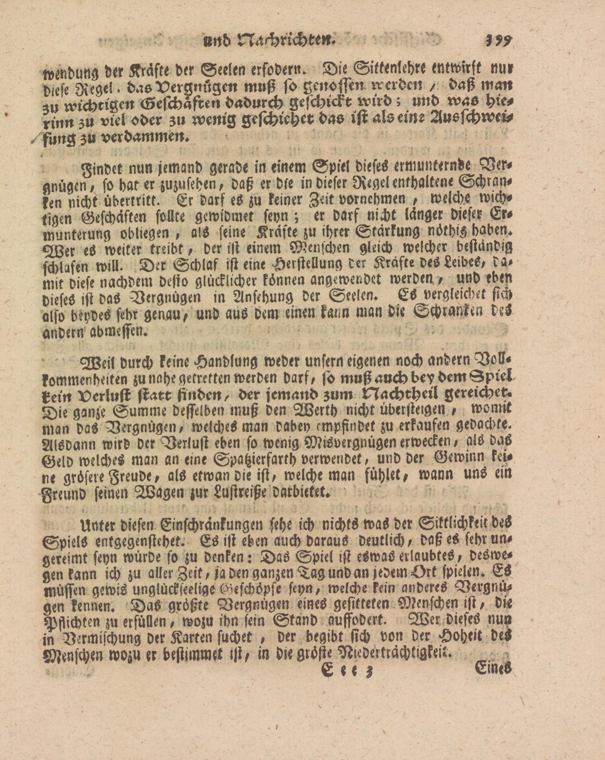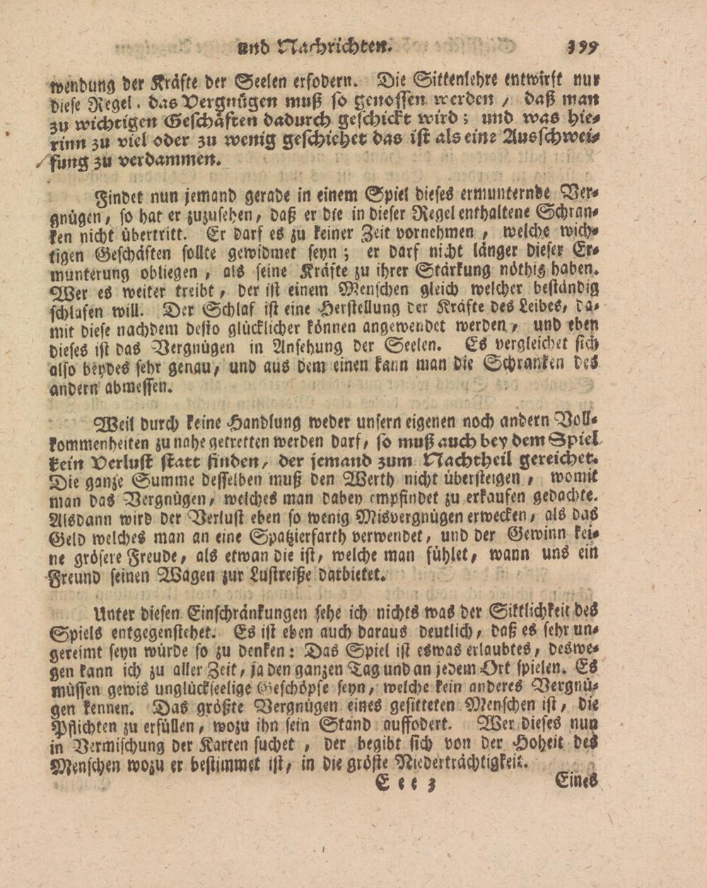 Unter diesen Einschränkungen sehe ich nichts was der Sittlichkeit deö Spiels entgegenstehet. Es ist eben auch daraus deutlich, daß es sehr ungereimt seyn würde so zu denken: Das Spiel ist eswas erlaubtes, deswegen kann ich zu aller Zeit, jaden ganzen Tag und an jedem-Ort spielen. Es müssen gewis unglückseelige Geschöpfe seyn, welche kein anderes Vergnügen kennen. Das größte Vergnügen eines gesitteten Menschen rst, die Pflichten zu erfüllen, wozu ihn sein Stand ouffodert. Wer dieses nun in Vermischung Der Karten suchet , Der begibt sich von der Hoheit des Mnschen wozu er bestimmet rst, in die gröste Niederträchtigkeit.