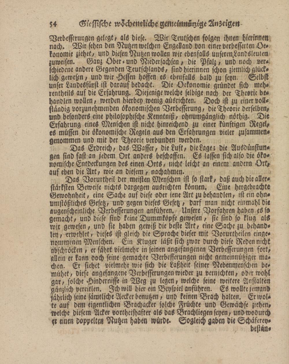 Das Vorurtheil der meisten Menschen ist so stark, daß auch die allerstärksten Beweise nichts dargegen ausrichten können. Eine hergebrachte Gewohnheit, eine Sache auf diese oder jene Art zu behandle», ist ein ohn- umstößliches Gesetz, und gegen dieses Gesetz , darf man nicht einmahl die augenscheinliche Verbesserungen anführen. Unsere Vorfahren haben es ss gemacht, und diese sind keine Dummköpfe gewesen , sie sind so klug als wir gewesen, und sie haben gewiß die beste Art, eine Sache zu behänd- len, erwehlet, dieses ist gleich die Sprache dieser mit Vorurtheilen eingenommenen Menschen. Ein Kluger laßt sich zwar durch diese Reden nicht abschröcken , er fahrt vielmehr in seinen angefangenen Verbesserungen fort, allein er kann doch seine gemachte Verbesserungen nicht gemeinnütziger machen. Er sichet vielmehr wie sich die Laßheit seiner Nebenmenschen bemühet, diese angefangene Verbesserungen wieder zu vernichten, oder wohl gar, solche Hindernisse in Weg zu legen, welche seine weitere Anstalten gänzlich vereitlen. Ich will hier ein Beyspiel anführen. Es wollte jemand jährlich seine sämtliche Aecker benutzen, und keinen Brach halten. Er wolle auf dem eigentlichen Brachacker solche Früchte und Gewächse zrehen, welche diesem Acker vortheishafter als das Brachliegen seyen, und wodurch einen doppelten Nutzen haben würde. Sogleich gaben die Schäftrey-