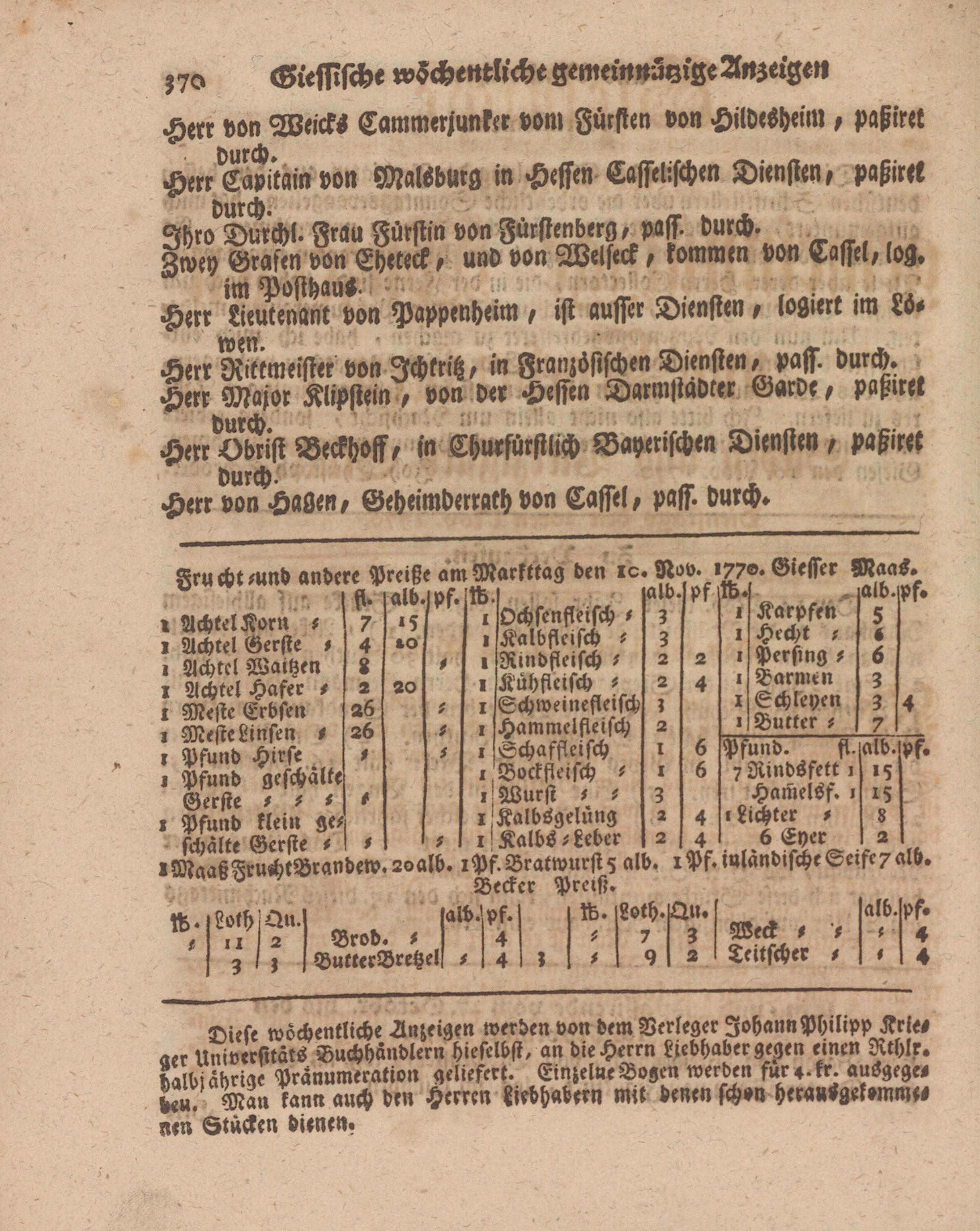 Diese wöchentliche Anzeigen werden von dem Verleger Johann Philipp Krkeo aer Univerfltäts Buchhändlern hiesclbst, an die Herrn Liebhaber gegen einen Rthlr. balbi ädrige Pränumeration geliefert. Einzelne Bogen werden fur4.fr. auSgege-