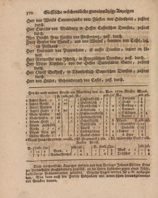 Frucht »und andere Preiße am Markttag den la.Nav. '77--Giesser Maa«, ft. alb. pf. ft. «Ib. pf ft. aid pf.