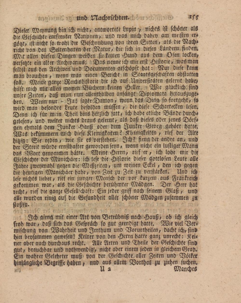 Dieser Meynung bin ich nicht, antwortete Lnpin, nichts ist schöner alS die Geschichte entfernter Nationen, und was mich dabcy am meisten ergötzt, ist nicht so wohl die Beschreibung von ihren Sitten, als die Nachricht von den Seltenheiten der Natur, die sich in diesen Landern finden Mit allen diesen Dingen werden-sie keinen -Hund aus dem -Ösen locken, versetzte ein alter Archivarin^ Das nenne ich mir erst Historie, was man selbst aus den Archiven und Dokumenten geschöpft hat: Nur diese kann man brauchen , wenn man einen Bericht in Staatsgeschäften abstattea soll. Meine ganze Reichshistorie die ich auf .Universitäten gelernt habe- hilft mich mit allen meinen Büchern keinen Heller. Wie glücklich sind unsre Zeiten, daß man nun allenthalben anfängt D-Plomata herauszugeben. Wenn nur - Ja! sagte Dämon, wenn das Ding so fortgeht, fo wird man besondre Leute besolden müssen , die diese Schartecken lesen. Denn ich für mein Theil bius herzlich satt, ich habe etliche Bande durchgelesen, und weiter nichts draus gelernt, als daß dieses oder jenes Dörf- gen ehmals dem Junker Hanß oder dem Junker Georg gehört hatte; Was bekümmern mich diese Kleinigkeiten? Klünigkeiten , rief der Alte hitzig : Sie Men, wie sie es verstehen. Ich? fieng der andre an, und der Streit würde ernsthafter geworden seyn, wenn nicht ein lustiger Mana das Mort genommen hätte. Meine Herrn, rief er, ich lobe mir die Geschichte der Manichäer: ich lese die Historie dieser gottlosen Leute alle Jahre zweymahl gegen die Meßzeiten, um meinen Eckel, den ich gegen die heutigen Manichäer habe, von Zeit zu Zeit zu verstärken. Und ich lese nichts lieber, rief ein junger Mensch der vor kurzem aus Frankreich gekommen war, als die Geschichte berühmter Mädgen. Der Herr hat recht, rief die ganze Gescll'chaft: Ein jeder griff nach seinem Glaß , und alle wurden einig aus die Gesundheit aller schöner Mädgen zusammen zir stoßen.
