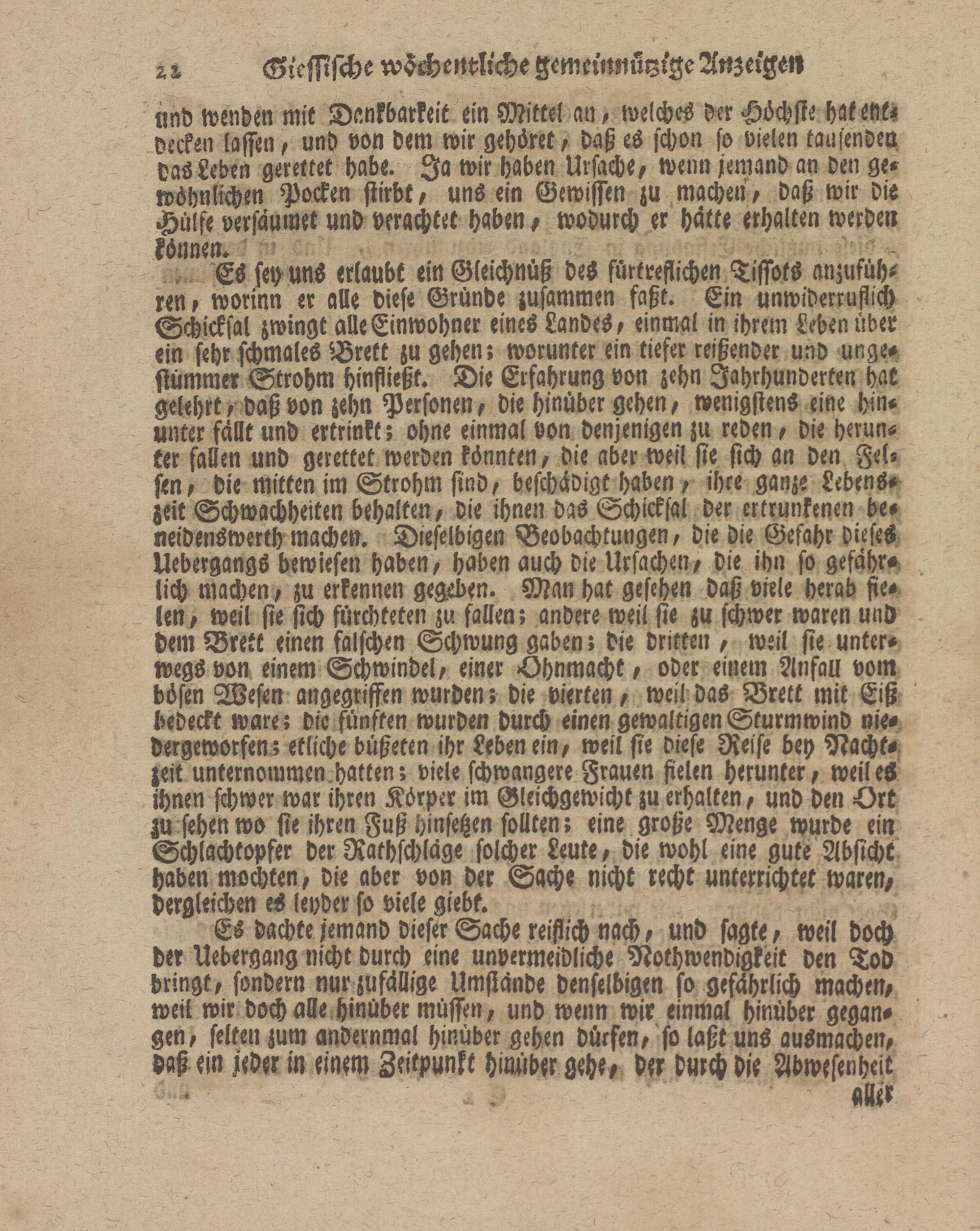 Es sey uns erlaubt ein Gleichnuß des fürtreflichen Tissots anzufuhren, worinn er alle diese Gründe zusammen faßt. Em unwiderruflich Schicksal zwingt alle Einwohner eines Landes, einmal in ihrem Leben über ein sehr schmales Brett zu gehen; worunter ein tiefer reißender und unge- stümmer Strohm hinfließt. Die Erfahrung von zehn Jahrhunderten hat gelehrt, daß von zehn Personen, die hinüber gehen, wenigstens eine hinunter fällt und ertrinkt; ohne einmal von denjenigen zu reden, die herunter fallen und gerettet werden könnten, die aber weil sie sich an den Felsen, die mitten im Strohm sind, beschädigt haben, ihre ganz- Lebenszeit Schwachheiten behalten, die ihnen das Schicksal der ertrunkenen be- neidenswerth machen. Dieselbigen Beobachtungen, die die Gefahr dieses Uebergangs bewiesen haben, haben auch die Ursachen, die ihn so gefährd lich machen, zu erkennen gegeben. Man hat gesehen daß viele herab fielen, weil sie sich fürchteten zu fallen; andere weit sie zu schwer waren und dem Brett einen falschen Schwung gaben; die dritten , weil sie unterwegs von einem Schwindel, einer -Ohnmacht, oder einem Anfall vom bösen Wesen angegriffen wurden; die vierten, weil das Brett mit Eiß bedeckt wäre; die fünften wurden durch einen gewaltigen Sturmwind nie- dergeworfen; etliche büßeten ihr Lebenein, weil sie diese Reise bey Nachtzeit unternommenchatten; viele schwangere Frauen fielen herunter, weites ihnen schwer war ihren Körper im Gleichgewicht zu erhalten, und den Ort zu sehen wo sie ihren Fuß hinsetzen sollten; eine große Menge wurde ein Schlachtopfer der Rathschläge solcher Leute, die wohl eine gute Absicht haben mochten, die aber von der Sache nicht recht unterrichtet waren, dergleichen es leyder so viele giebt.