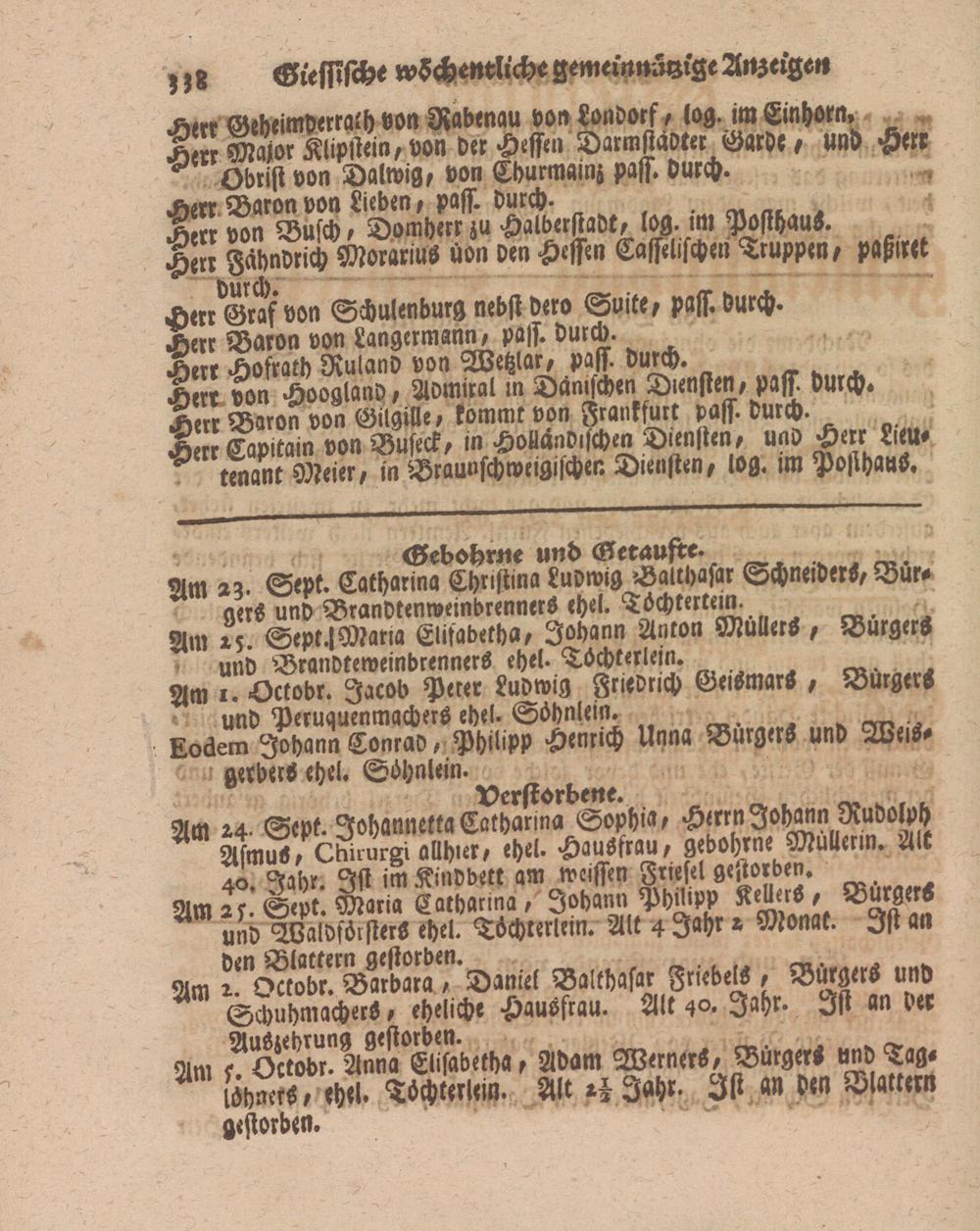Am 24. Sept. Johannetta Catharina Sophia, Herrn Johann Rudolph Asmus, Chirurgi allhier, ehel. Hausfrau, gebohrne Müllerin. A Ao ^abr Ist im Kindbett am weissen Friesel gestorben.