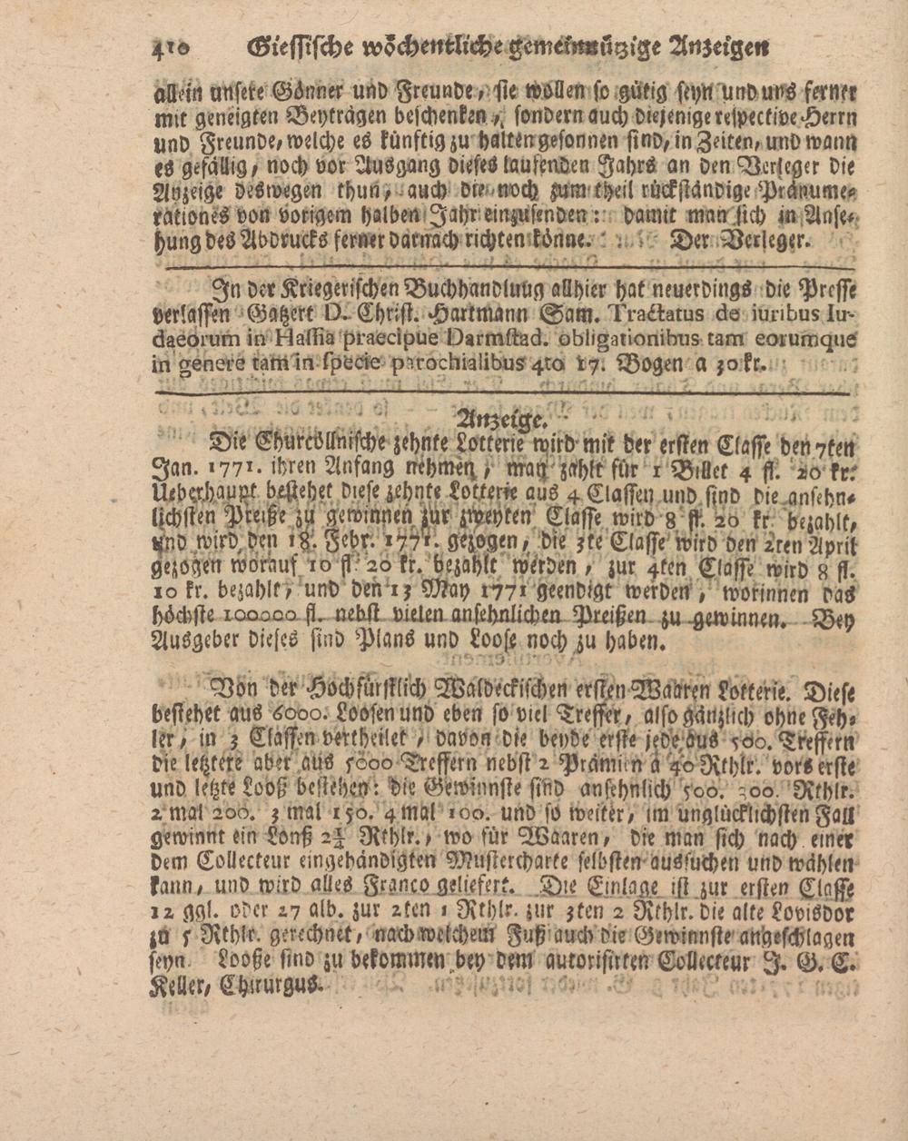 Von der Hochfürstlich Waldeckischen ersten Maaren Lotterie. Diese bestehet aus £000. Loosen und eben so viel Treffer, also gänzlich ohne Fehler, in z Claffen vertheilet, davon die bevde erste jede.äus Treffern die letztere aber aus fLoo Treffern nebst 2 Prämiln a 40 Rthlr. vor< erste und letzte Looß bestehen: die Gewinnste sibd ansehnlich 5'06. ^00. Rthlr. r mal 2oö. z mal 150. 4 mal mo. und so weiter, im unglücklichsten Fall gewinnt ein Lonß 2^ Rthlr. > wo für Maaren, die man sich nach einer dem Collecteur eingehändigten Mustercharte seldsten ausluchen und wählen kann, und wird alles Franco geliefert. .Die Einlage ist zur ersten Classe 12 ggl. oder 27 alb. zur rtcn 1 Rthlr. zur zten 2 Rthlr. die alte Lovisdor zu 1 Rthlr. gerechnet, nachwetchem Fuß auch die Gewinnste an'gefchlagen seyn Looße sind zu bekommen bey dem autorisirten Collecteur I. G. C. Keller, ChirurguS.