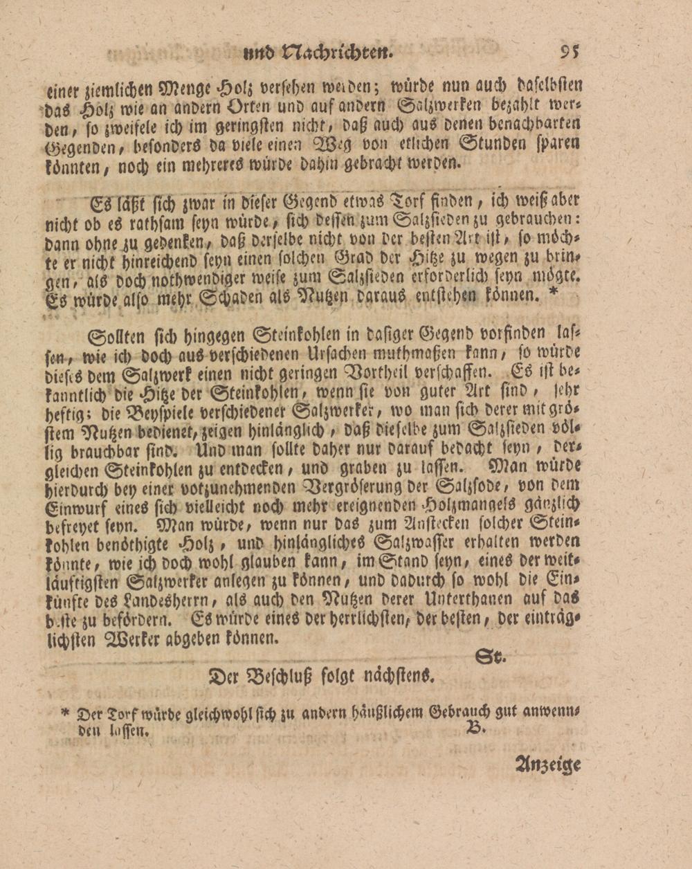 Es läßt sich zwar in dieser Gegend etwas Torf finden, ich weiß aber nicht ob es rathsam seyn würde, sich dessen zum Salzsieden zu gebrauchen: dann ohne zu gedenken, daß derselbe nicht von der besten Art i(l, so möchte er nicht hinreichend seyn einen solchen Grad der Hitze zu wegen zu bringen, als doch nothwendiger weise zum Salzsieden erforderlich seyn mögte. ES würde also mehr Schaden als Nutzen daraus entstehen können. ♦