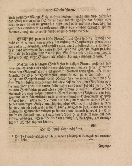 Sollten sich hingegen Steinkohlen in dasiger Gegend vorfinden lassen, wie ich doch aus verschiedenen Ursachen muthmaßen kann, so würde dieses dem Salzwerk einen nicht geringen Vorthcil verschaffen. Es ist bekanntlich die Hitze der Steinkohlen, wenn sie von guter Art sind , |ebr heftig; die Beyspiele verschiedener Salzwerker, wo man sich derer mitgro- siem Nutzen bedienet, zeigen hinlänglich, daß dieselbe zum Salzsieden völlig brauchbar sind. Und man sollte daher nur darauf bedacht seyn , dergleichen Steinkohlen zu entdecken, und graben zu lassen. Man würde hierdurch bey einer votzunehmenden Vergröserung der Salzsode, von dem Einwurf eines sich vielleicht noch mehr ereignenden Holzmangels gänzlich defreyet sevn. Man würde, wenn nur das zum Anstecken solcher Steinkohlen benöthigte Holz, und hinlängliches Salzwasser erhalten werden könnte, wie ich doch wohl glauben kann, im Stand seyn, eines der weit- läuftigsten Sakzwerker anlegen zu können, und dadurch so wohl die Einkünfte des Landesherrn, als auch den Nutzen derer Untcrthanen auf das d ste zu befördern. ES würde eines der herrlichsten, der besten, der einträglichsten Werker abgeben können.