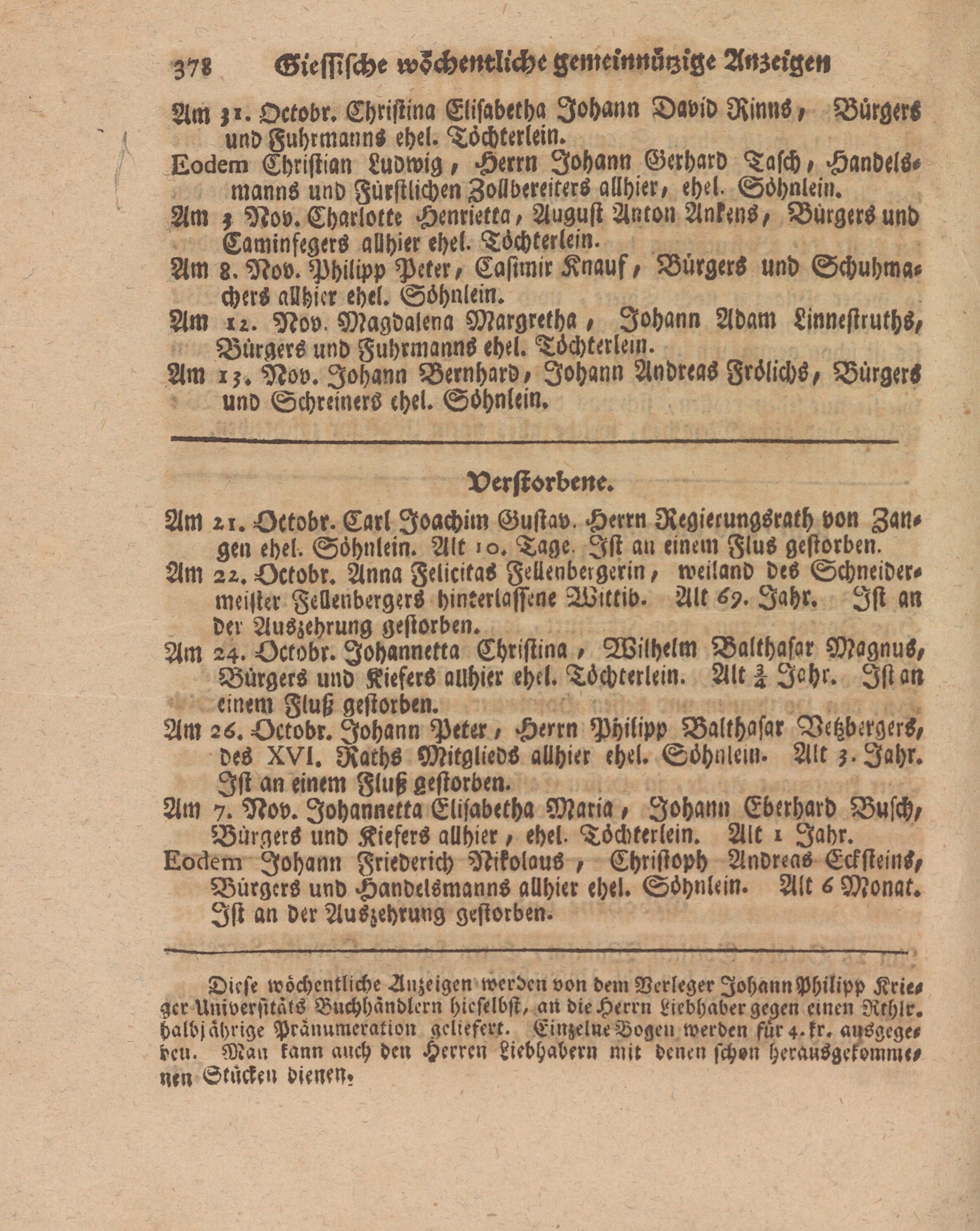 Eodem Johann Friederich Nikolaus , Christoph Andreas Ecksteins, Bürgers und Handelsmanns allhier ehel. Söhnlein. Alt 6 Monat. Ist an der Auszehrung gestorben.