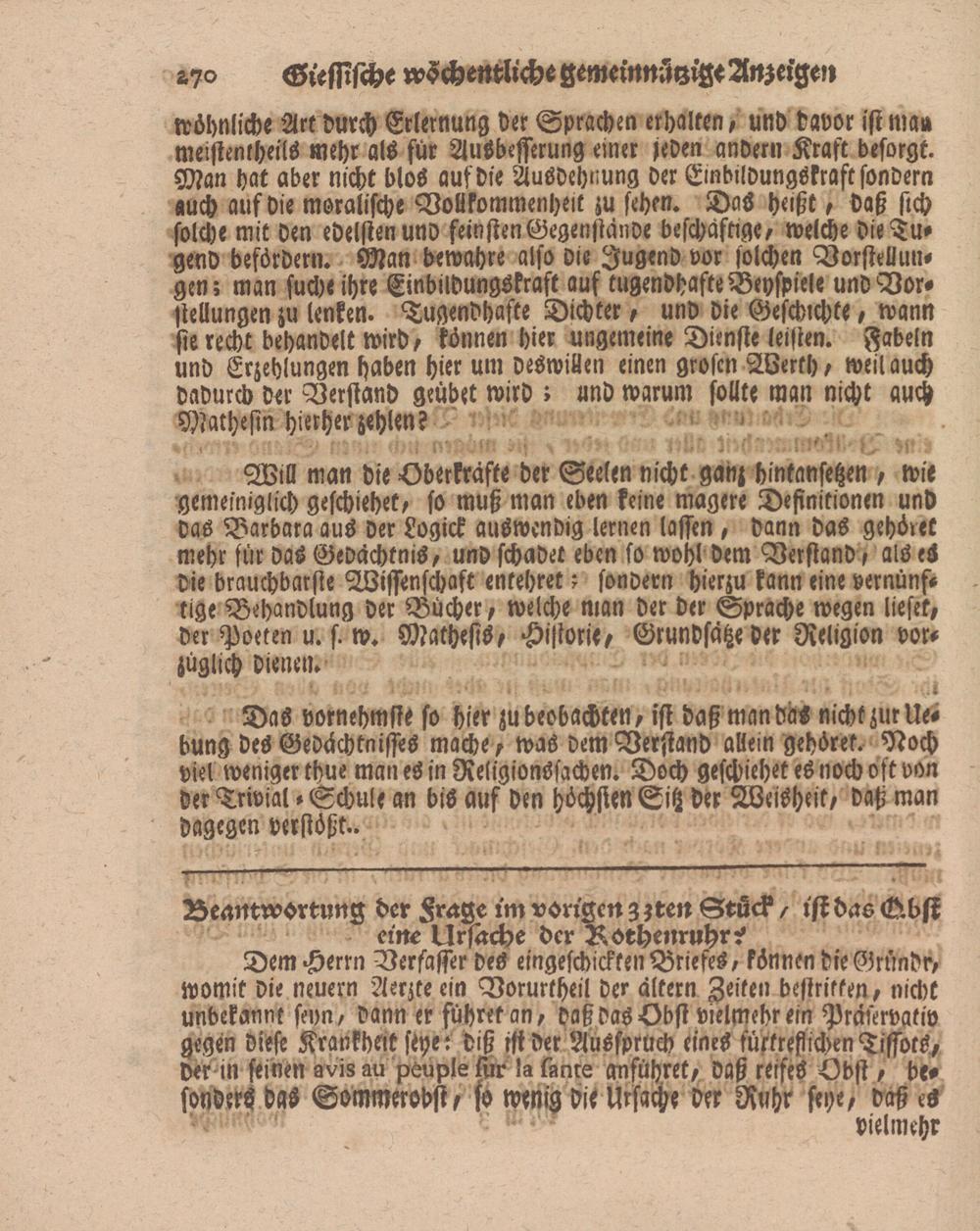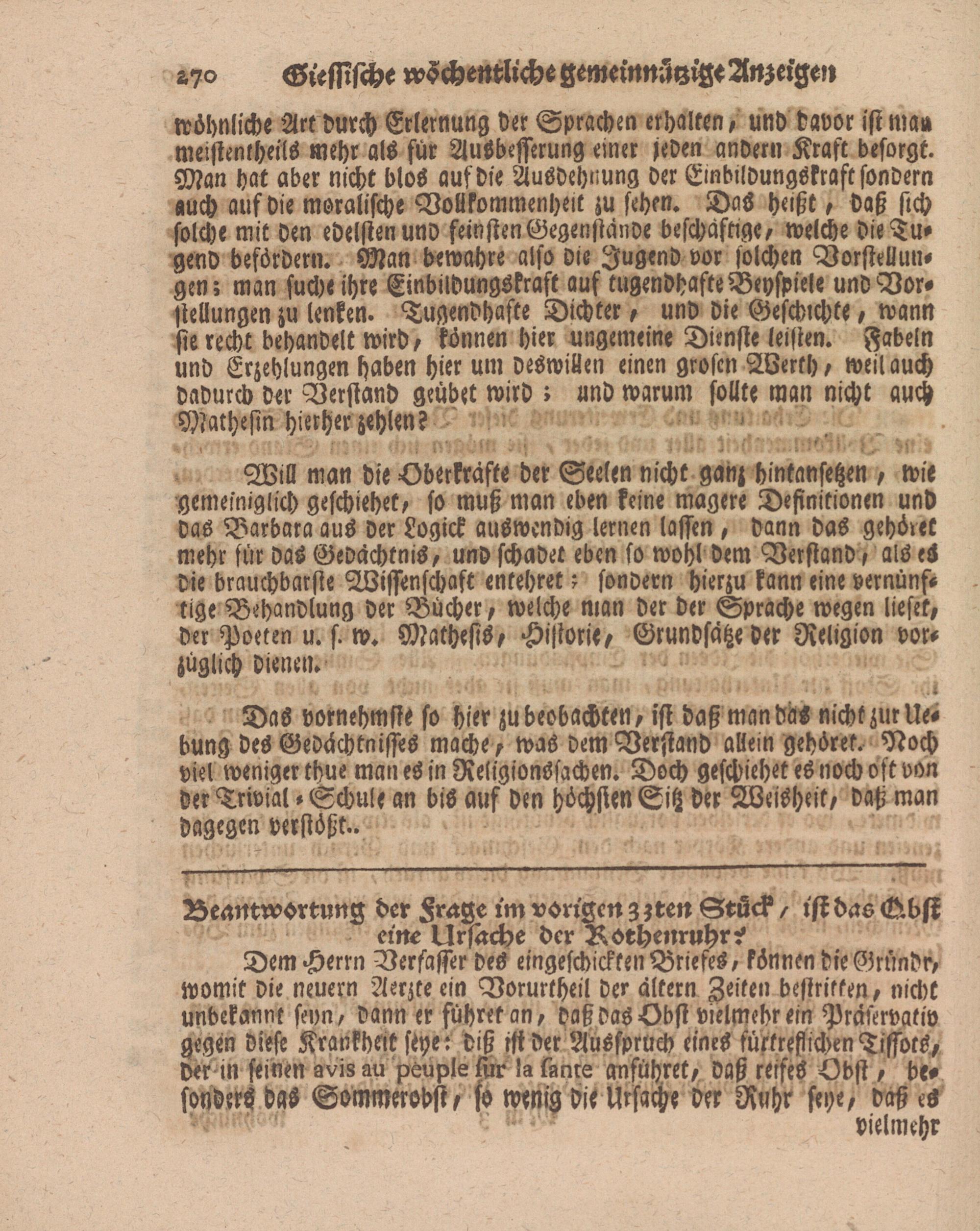 Dem Herrn Verfasser des eingeschickten Briefes, können die Gründe, womit die neuern Aerzte ein Vorurtheil der altern Zeiten bestritten, nicht unbekannt sevn, dann er führet an, daß das Obst vielmehr ein Präservativ gegen diese Krankheit ftye: diß ist der Ausspruch eines fürtrefiichen Tissots, der in seinen avis au peuple sirr la fanre anführet, daß reifes Obst , besonders das Sommerobst, so wenig die Ursache der Ruhr seye, daß es vielmehr