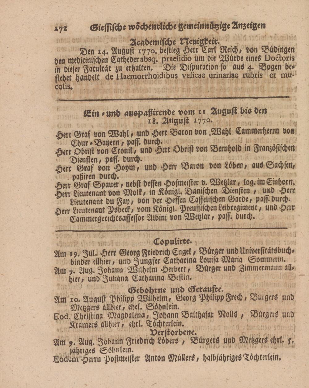 Den 14. August 1770. bestieg Herr Carl Reich, von Büdingen den medicinischen Cathederabsq. praefidio um die Würde eines Dotioris in dieser Jaculkal zu erhalten. Die Disputation so au« 4. Bogen be« stehet handelt de Haemorrhoidibus veiicae urinariae rubris et mu- cotis.