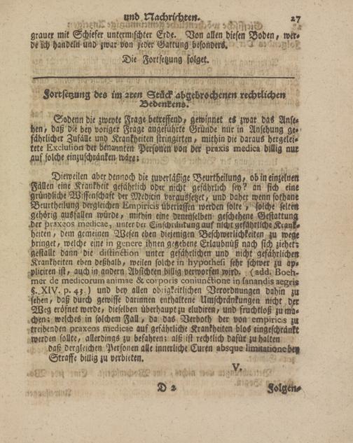 Dieweilen aber dennoch die zuverläßlge Beurtheilung, ob in einzelnen Fällen eine Krankheit gefährlich oder nicht gefährlich sey? an sich eine gründliche Wissenschaft der Medicin vLraussetzet, und daher wenn fothane Beurtheilung dergleichen Lmpiricis überlassen werden solke > solche selten gehörig ausfallen würde, mithin eine Denenfelben geschehene Gestattung der praxeos medicae, unter der Einschränkung auf nicht gefährliche Krankheiten , dem gemeinen Wesen eben diejenigen Beschwerlichkeiten zu Wege bringet, welche eine in genere ihnen gegebene Erlaubnüß nach sich ziehet? gestallt dann die diftintiion unter gefährlichen und nicht gefährlichen Krankheiten eben deßhalb, weilen solche in hypothefi sehr schwer zu ap- pliciren ist, auch in andern Absichten billig verworfen wird. (add. Boeh- mer de medicorum animae & corporis coniunftione in (anandis aegris p. 4).) und bey allen obrigkeitlichen Verordnungen dahin zu sehen, daß durch gewisse darinnen enthaltene Umfchränkungen nicht tyr Weg erüfnet werde, dieselben überhaupt zu eludiren, und ftuchtioß zu machen; welches in solchem Fall, da das Verboth der von empiricis zu treibenden praxeos medicae auf gefährliche Krankheiten bloS eingeschränkt werden sollte, allerdings zu befahren; alß ist rechtlich dafür zu halten