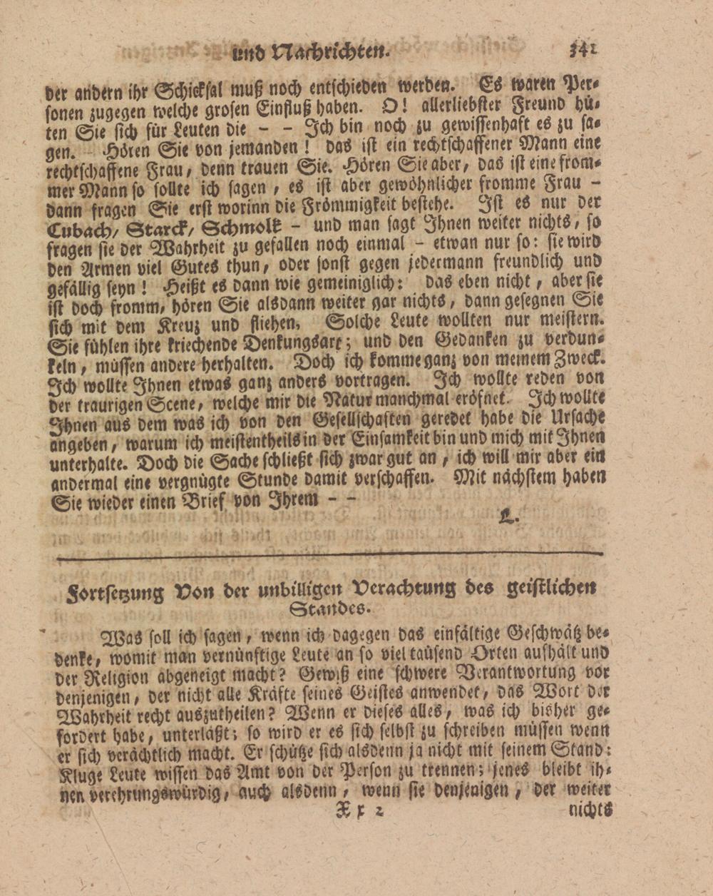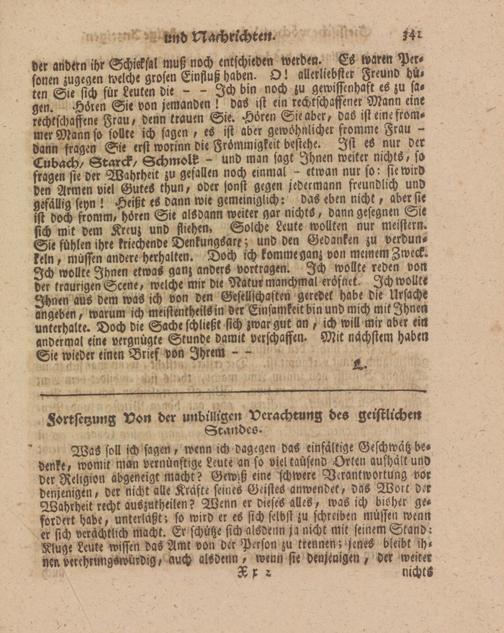 der andern ihr Schicksal muß noch entschieden werden. Es waren Personen zugegen welche grosen Einflußhab-n. O. allerliebsterFttUiivhu, ten Sie sich für Leuten Die — Ich bin noch zu gewissenhaft es zu sagen. A-n Sie von jemanden ! das ist -in rechtschaffener Mann eme rechtschaffene Frau, denn trauen Sie. Hören Si-abcr, das ist eme frommer Mann so sollte ich sagen , es ist aber gewöhnlicher fromme Frau - dann fragen Sie erst worinn die Frömmigkeit bestehe. Ist eS nur der Lu back/ Starck/ Sckmolk - und man sagt fghn-n weiter mchtS, sa fragen st- d-r Wahrheit zu gefallen noch einmal - -twan nur fo: ftewirö den Armen viel Gute« khun, oder fönst gegen z-d-rmann freundlich und a-fällia s-vn ! Heißt -S dann wie gemeiniglich: das eben nicht, ab-rste ist doch fromm, hören Sie alsdann weiter gar nichts, dann gesegnen Sie sich mit dem Kreuz und fliehen. Solch- Leute wollten nur meistern. Sie fühlen ihre kriechende D-nkungSarc; und den Gedanken zu verdunkeln , muffen andere herhalten. Doch ich komme ganz von meinem Zweck. <M> wollte Ihnen etwa« ganz ander« vorkragen. Ich wollte reden von der traurigen Scene, welche mir die Natur manchmal -rösn-t. Ich wollte °fhnen aus dem was ich von den Gesellschaften geredet habe die Ursache angeben, warum ich meistentheils in der Einsamkeit bin und mich Mik Ihnen untcrbalte. Doch die Sache schließt sich zwar gut an, ich will mir aber ein andermal eine vergnügte Stunde damit verschaffen. Mit nächstem habe» Sie wieder einen Brief von Ihrem - -