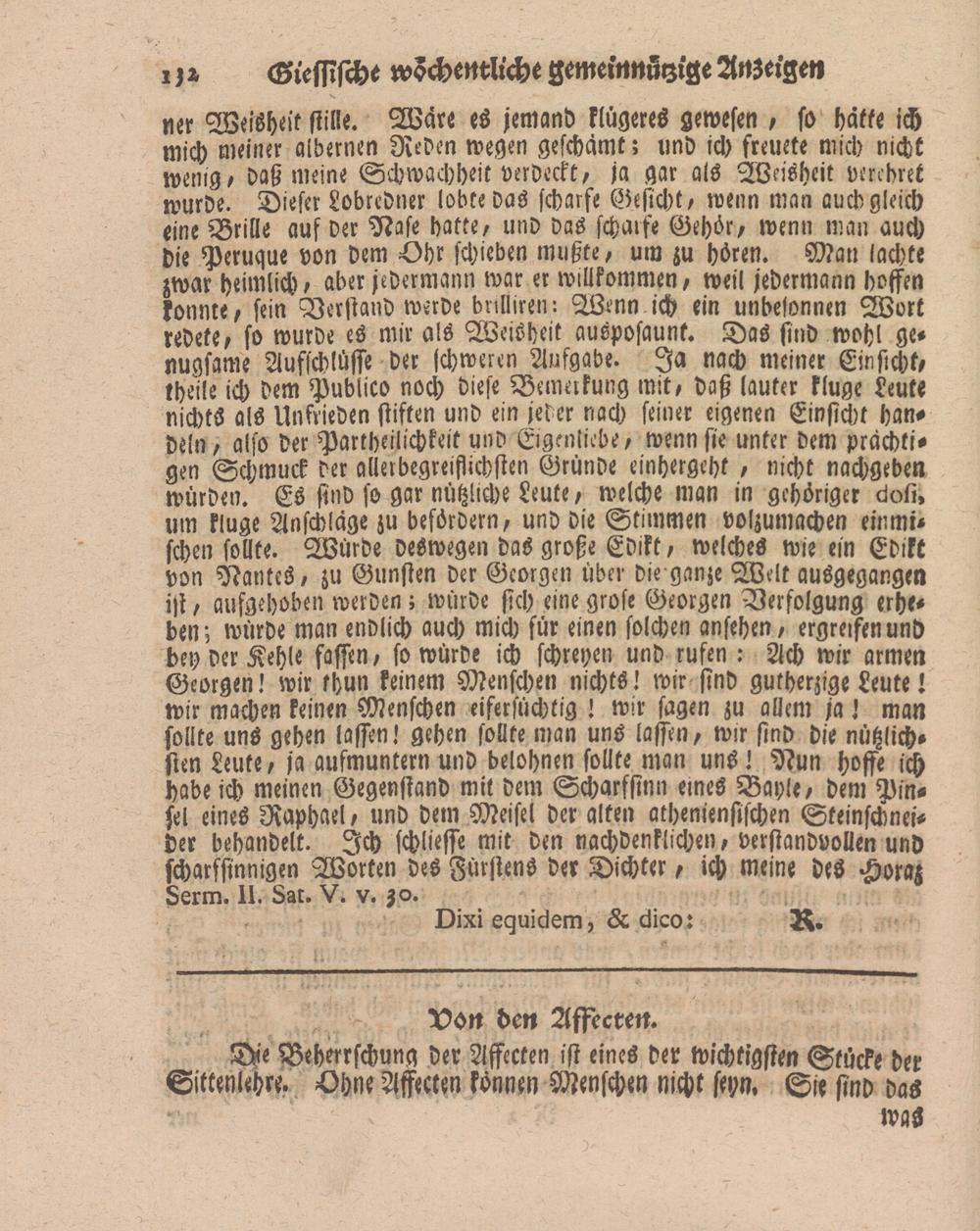 Georgen! wir thun keinem Menschen nichts! wir sind gutherzige Leute! wir machen keinen Menschen eifersüchtig ! wir sagen zu allem ja ’ man sollte uns gehen lassen! gehen sollte man uns lassen, wir sind die nützlichsten Leute, ja aufmuntern und belohnen sollte man uns! Nun hoffe ich habe ich meinen Gegenstand mit dem Scharfsinn eines Bayle, dem Pinsel eines Raphael, und dem Meise! der alten atheniensifchen Steinschneider behandelt. Ich schliesse mit den nachdenklichen, verstandvollen und scharfsinnigen Worten des Fürstens der Dichter, ich meine des Horaz Serm. 11. Sat. V. v. zc>.