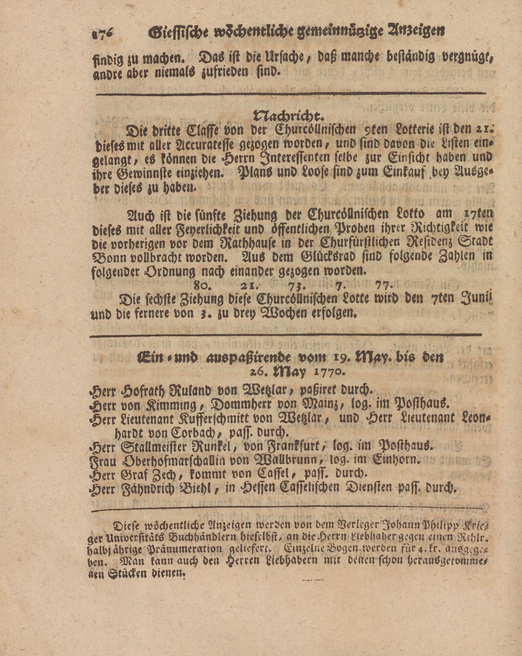Diese wöchentliche Anzeigen werden von dein Verleger Johann Philipp gerUmversitäts Buchhändlern hicsclbst, andieHerrn rrebbadergegen euren Nchlr. halbjährige Pränumeration geliefert. Einzelne Bogen werden fut4.fr. ausgege-- ben. Man kann auch den Herren Liebhabern mit denen schon herausgelomme, arn Stücken dienen.