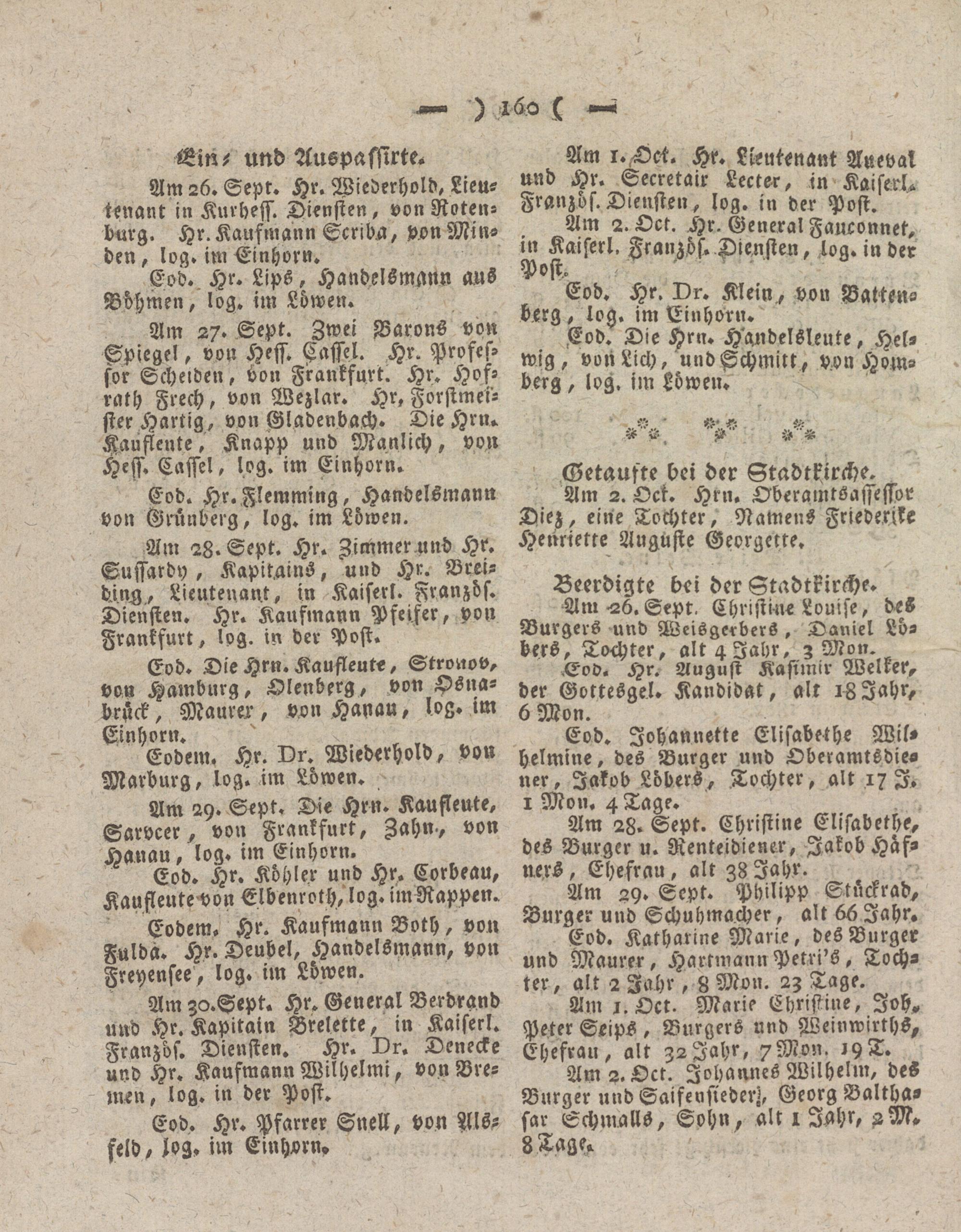 Am 27. Sept. Zwei Barons von Spiegel, von Hess, ßassel. Hr. Professor Scheiden, bon Frankfurt. Hr. Hofrath Frech, von Wezlar. Hr, Forstmeister Hartig, von Gladenbach. Die Hrn. Kaufleute, Knapp und Manlich, von Hess. Cassel, log. im Einhorn.