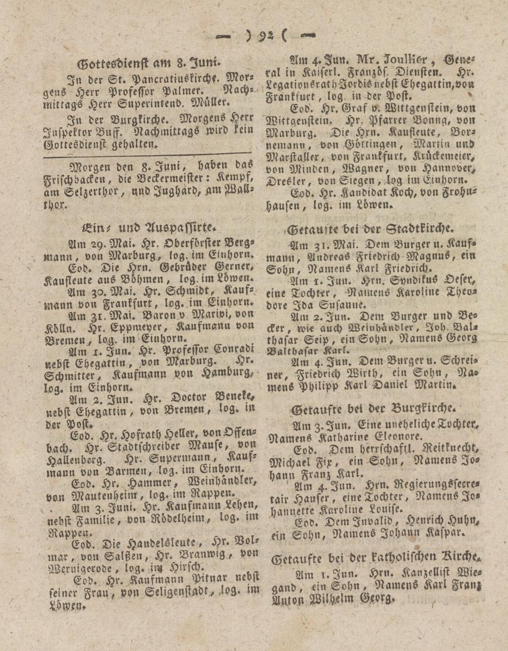 Am 1. Jun. Hr. Professor Conradr nebst Ehegattin, von Marburg. Hr. Schmitter , Kaufmann von Hamburg, log. im Einhorn.