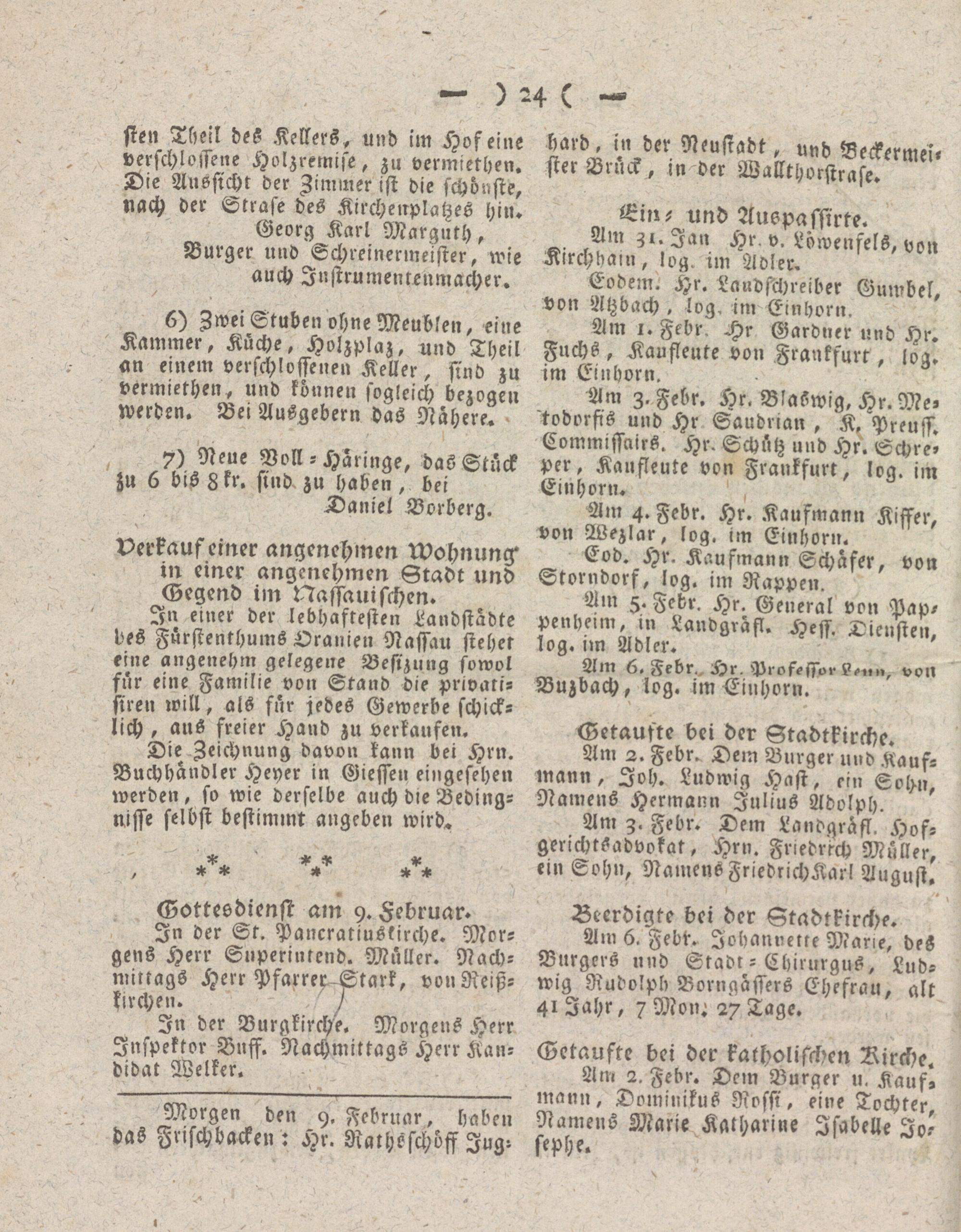 Am 5. Febr. Hr. General von Pap- penhelm, in Landgräfl. Hess. Diensten, log. nn Adler.