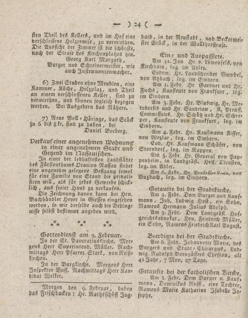 Am 3. Febr. Dem Landgräfl. Hof- gerichtsadvokat, Hrn. Friedrrch Müller, ein Sohn, Namens FriedrichKarl August.