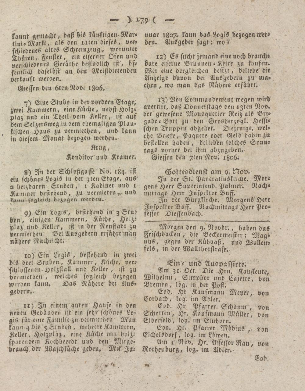 1'3) Von Commandement wegen wird avertirr, daß Donnerstags den »Zten Nov. der gewesene Mousquetier Reiz als Brr- gäbe-Bott zu den Grosherzogl. Hessischen Truppen abgehek. Diejenige, welche Briefe, Paquere oder Geld dahin zu bestellen haben, belieben solches Sonntags vorher bei ihm abzugeben.