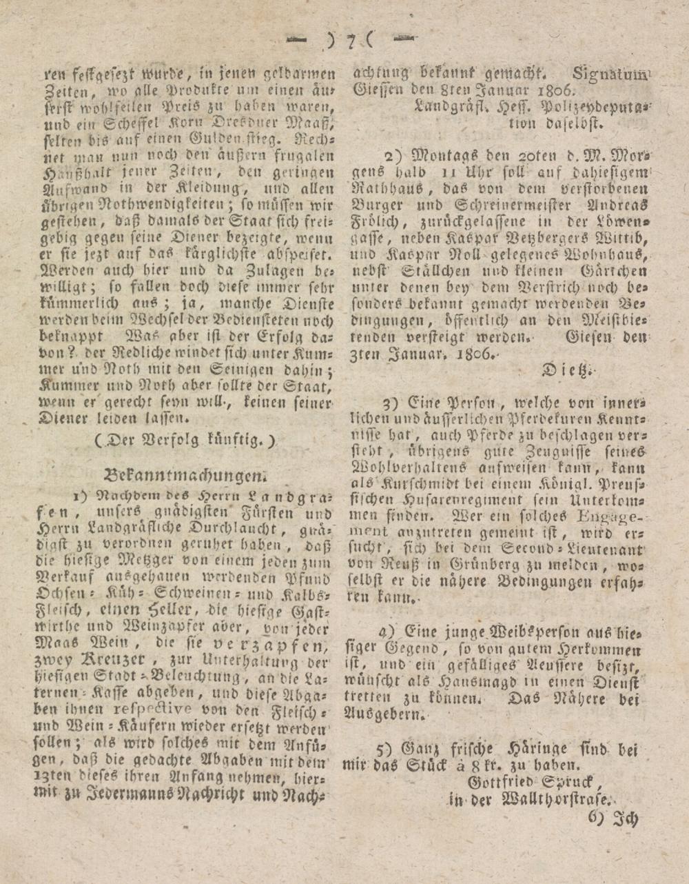 achtuug bekannt gemacht. Signatum1 Giessen den 8 t en Januar 1806.
