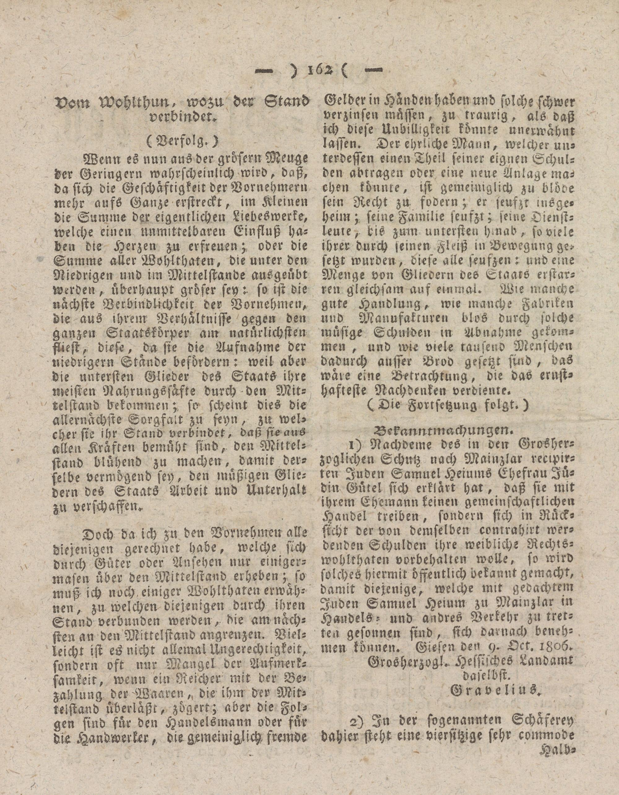 i) Nachdeme des in den Grosherzoglichen Schutz nach Mainzlar reclpir- ten Juden Samuel Heiums Ehefrau Jüdin Gürel sich erklärt har, daß sie mit ihrem Ehemann keinen gemeinschaftlichen Handel treiben, sondern sich in Rücksicht der von demselben conrrahirt werdenden Schulden ihre weibliche Rechts- wvhlthaten Vorbehalten wolle, so wird solches hiermit öffentlich bekannt gemacht, damit diejenige, welche mit gedachtem Juden Samuel Heium zu Mainzlar in Handels - und andres Verkehr zu tret- tea gesonnen sind, sich darnach benehmen können. Giesen den 9. Oct. 1806.