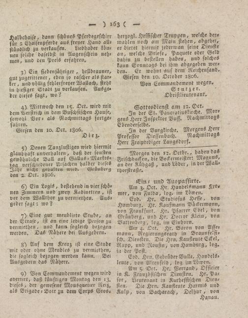 Eob. Hr. Studiosus Hesse, von Hamburg. Hr. Kaufmann Backermann, von Frankfurt. Hr. Pfarrer Ebel, von Grünberg, und Hr. Donor Klein, von Battenberg, log. im Einhorn.