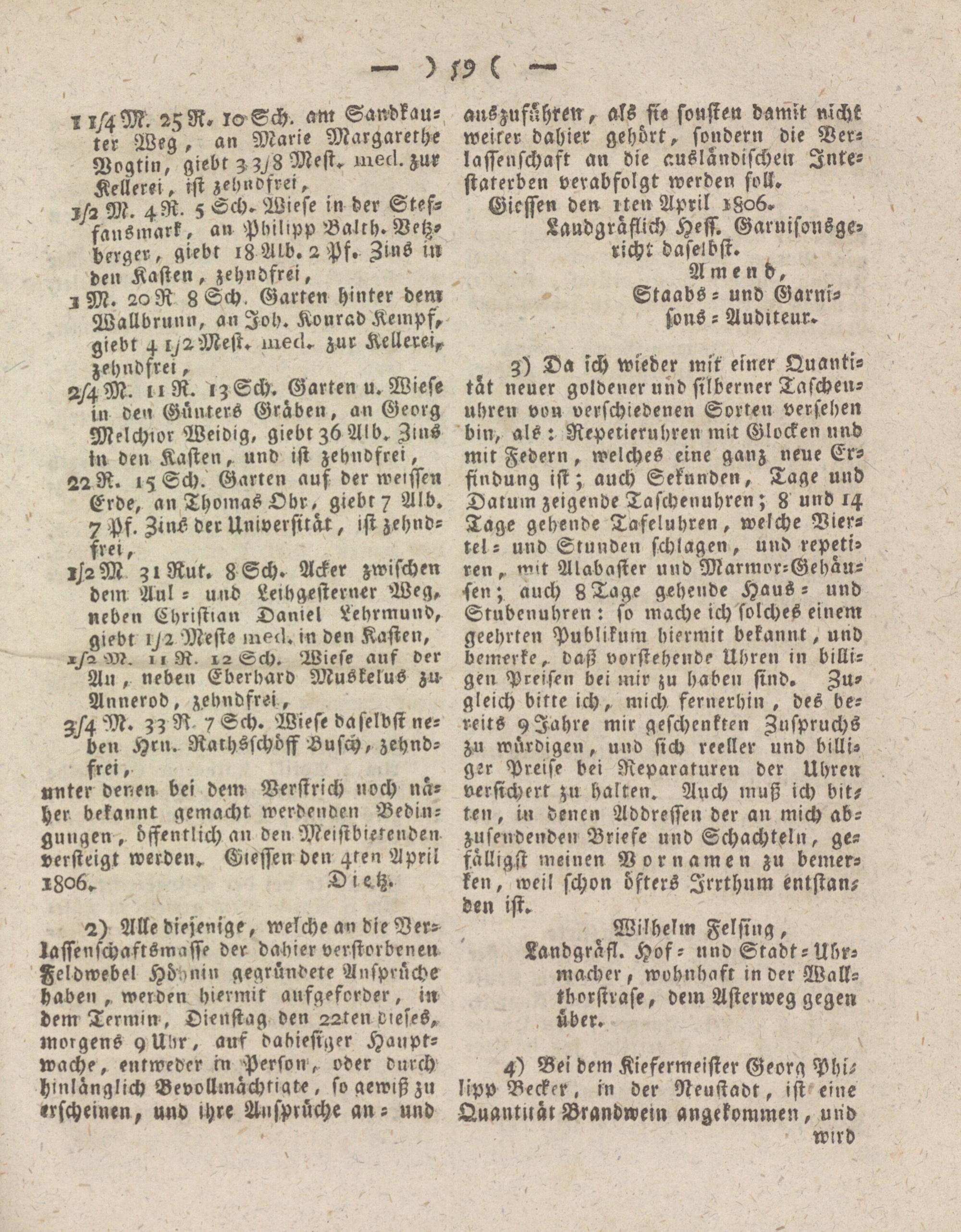 unter denen bei dem Verstrich noch naher bekannt gemacht werdenden Bedingungen , öffentlich an den Meistbietenden versteigt werden, Giessen den 4fen April 1806, Dietz.