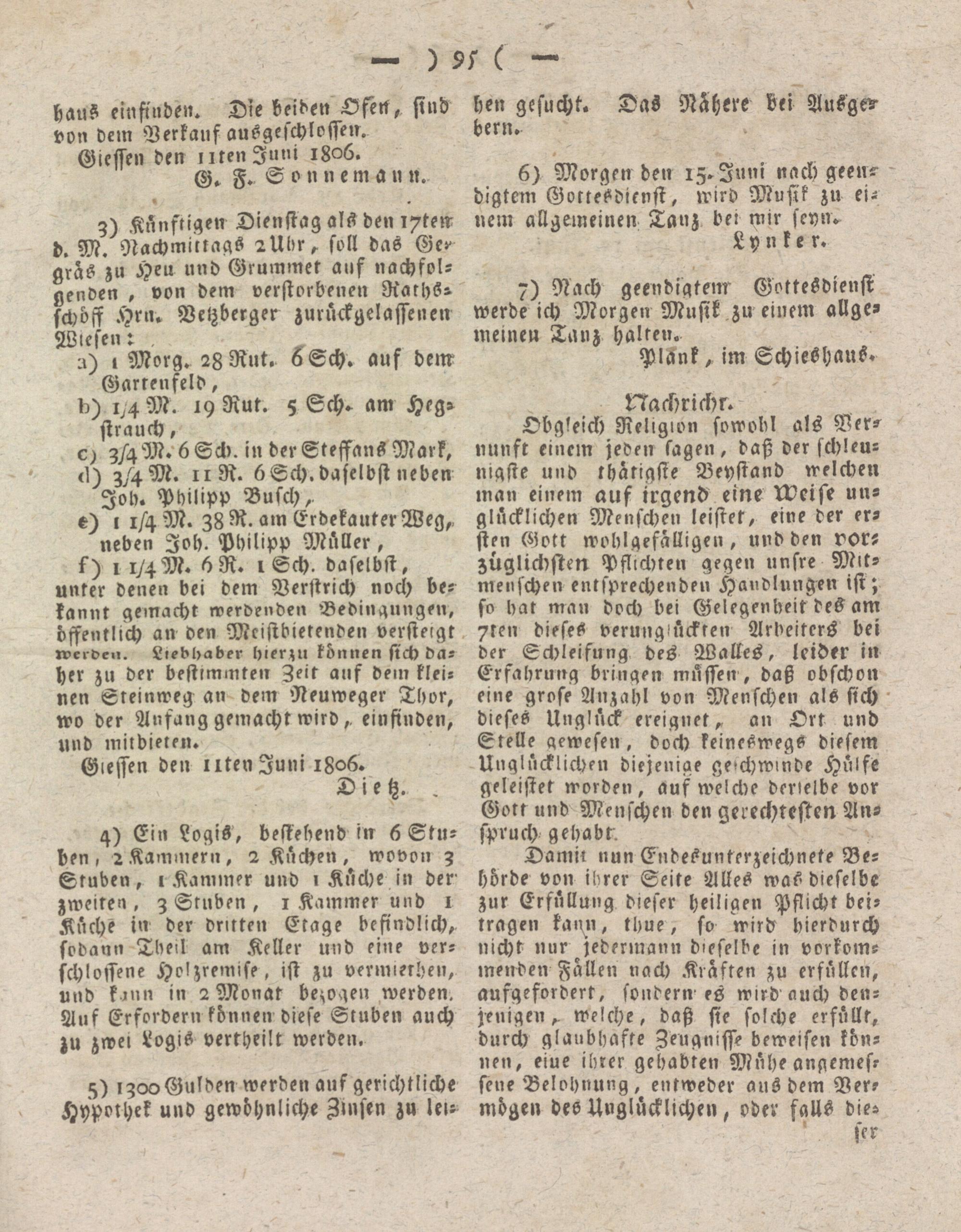 Obgleich Religion sowohl als Vernunft einem jeden lagen, daß der schleunigste und thätigste Veystand welchen man einem auf irgend eine Weise unglücklichen Menschen leistet, eine der ersten Gott wohlgefälligen, und den vorzüglichsten Pflichten gegen unsre Mitmenschen entsprechenden Handlungen ist; so bat man doch bei Gelegenheit des am 7ten dieses verungsückren Arbeiters bei der Schleifung des Walles, leider in Erfahrung bringen müssen , daß obschon eine grose Anzahl von Menschen als sich dieses Unglück ereignet,, an Ort und Stelle gewesen, doch keineswegs diesem Unglücklichen diejenige geschwinde Hülfe geleistet worden, auf welche derielbe vor Gott und Menschen den gerechtesten Anspruch gehabt-.