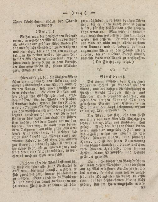 Da nun die bisherigen Nachforschungen nach diesem Menschen , und die schon am 29. Mai erlassenen Steckbriefe fruchtlos waren, so siehet mau sich veranlasset, alle Obrigkeiten hierdurch zu ersuchen, auf den beschriebenen Weih Acht geben, ihn im Belretungefalle arren- ren