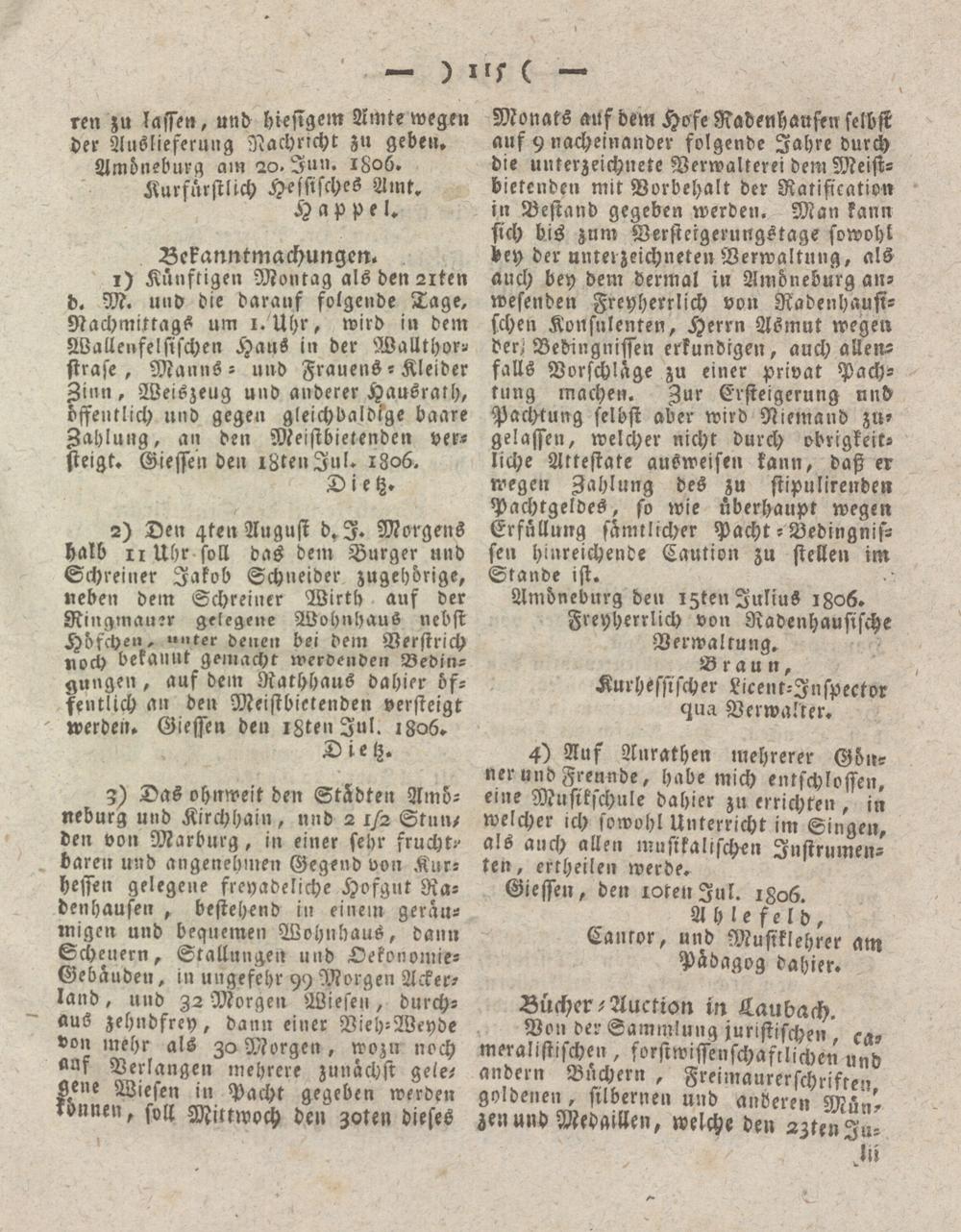 Monats auf dem Hofe Radenhaufen selbst auf 9 nacheinander folgende Jahre durch die unterzeichnete Verwalterei dem Meistbietenden mit Vorbehalt der Ratification in Bestand gegeben werden. Man kann sich bis zum Versteigerungstage sowohl bey der unterzeichneten Verwaltung, als auch bey dem dermal in Amöneburg anwesenden Freyherrlich von Radenhausi- schen Konsnlenten, Herrn Asmut wegen fr er; Bedingnissen erkundigen, auch allenfalls Vorschläge zu einer privat Pachtung machen. Zur Ersteigerung und Pachtung selbst aber wird Niemand zn- gelassen, welcher nicht durch obrigkeitliche Attestate ausweisen kann, daß er wegen Zahlung des zu stipulirenden Pachtgeldes, so wie überhaupt wegen Erfüllung sämtlicher Pacht - Vedingnis- sen hinreichende Caution zu stellen im Stande ist.