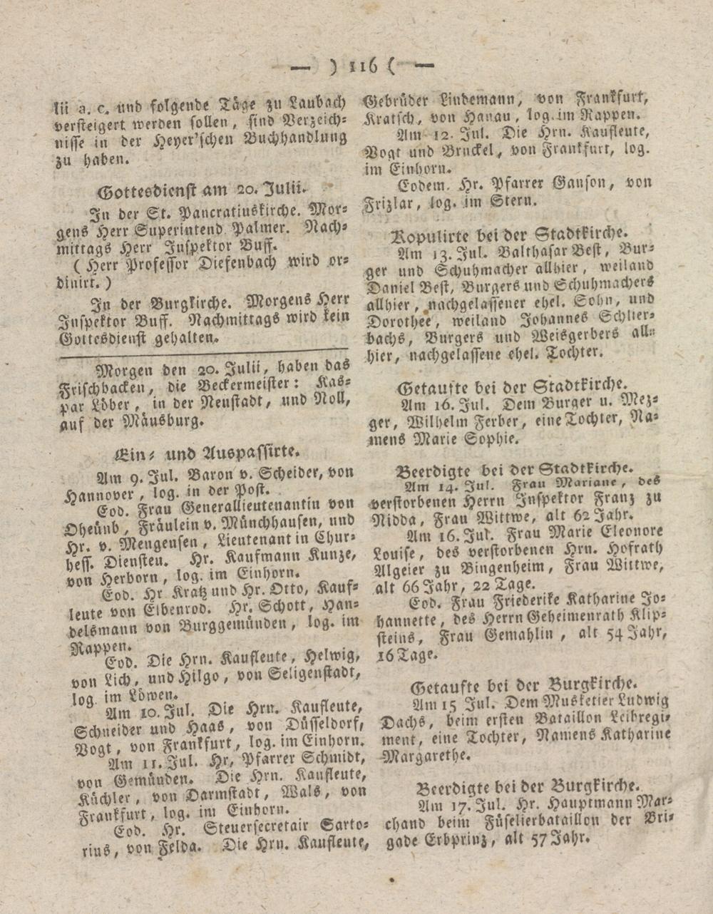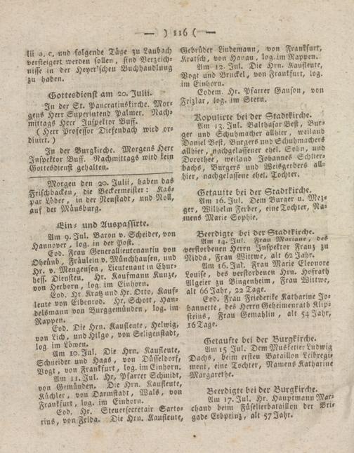 \ilni i k. Jul. Hr, Pfarrer Schmidt, von Gemünden. D'-e Hrn. Kaufleute, Küchler, von Darmstadt, Wals, von Frankfurt, log. im Einhorn.