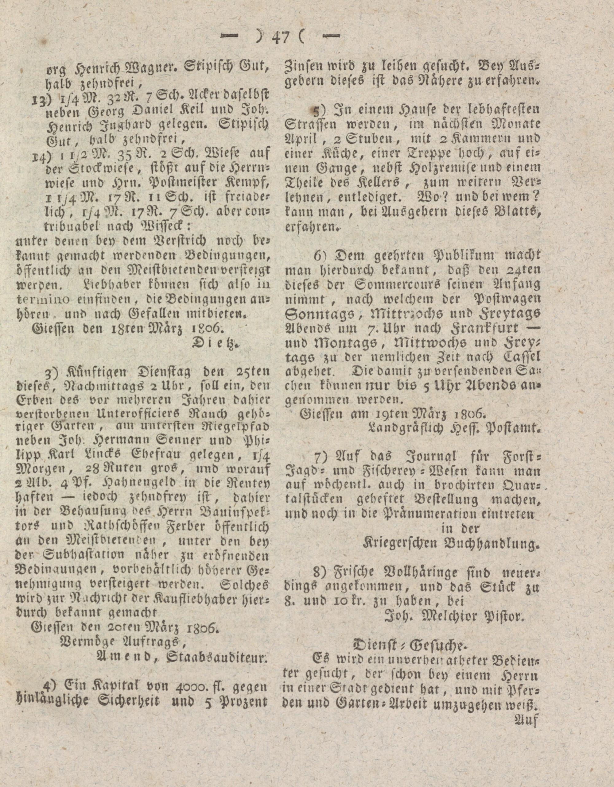 7) Auf das Journal für Forst- Jagd- und Fischerey - Wesen kann man auf wöchentl. auch in brvchirten Quartalstücken geheftet Bestellung machen, und noch in die Pränumeration eintreten in der