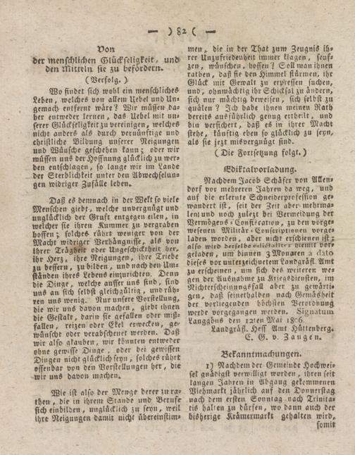 Nachdem Jacob Schäfer von Allen- dorf vor mehreren Jahren da weg, und auf die erlernte Schneiderprofession gewandert ist, seit der Zeit aber mehrma- len1, unb noch zulezt bei Vermeidung der Vermögens - Confi-cation, zu den vvrge- wesenen Militär - Couseriptionen vorgeladen worden , ober nicht erschienen isti also rnirtfr berfelbe edi<£talitcr l)iemi t VOt- geladen, um binnen g Monaten a dato dieses vor unterzeichnetem Landgrafl. Amt zu erscheinen, um sich des weiteren wegen der Ausnahme zu Kriegsdiensten, im Nichterscheinnngsfaü aber zu gewärtigen, daß seinethalben nach Gemäshei't der vorliegenden höchsten Verordnung werde vorgegangen werden. Signatum Langgöns den 12ten Mai 1Sr6