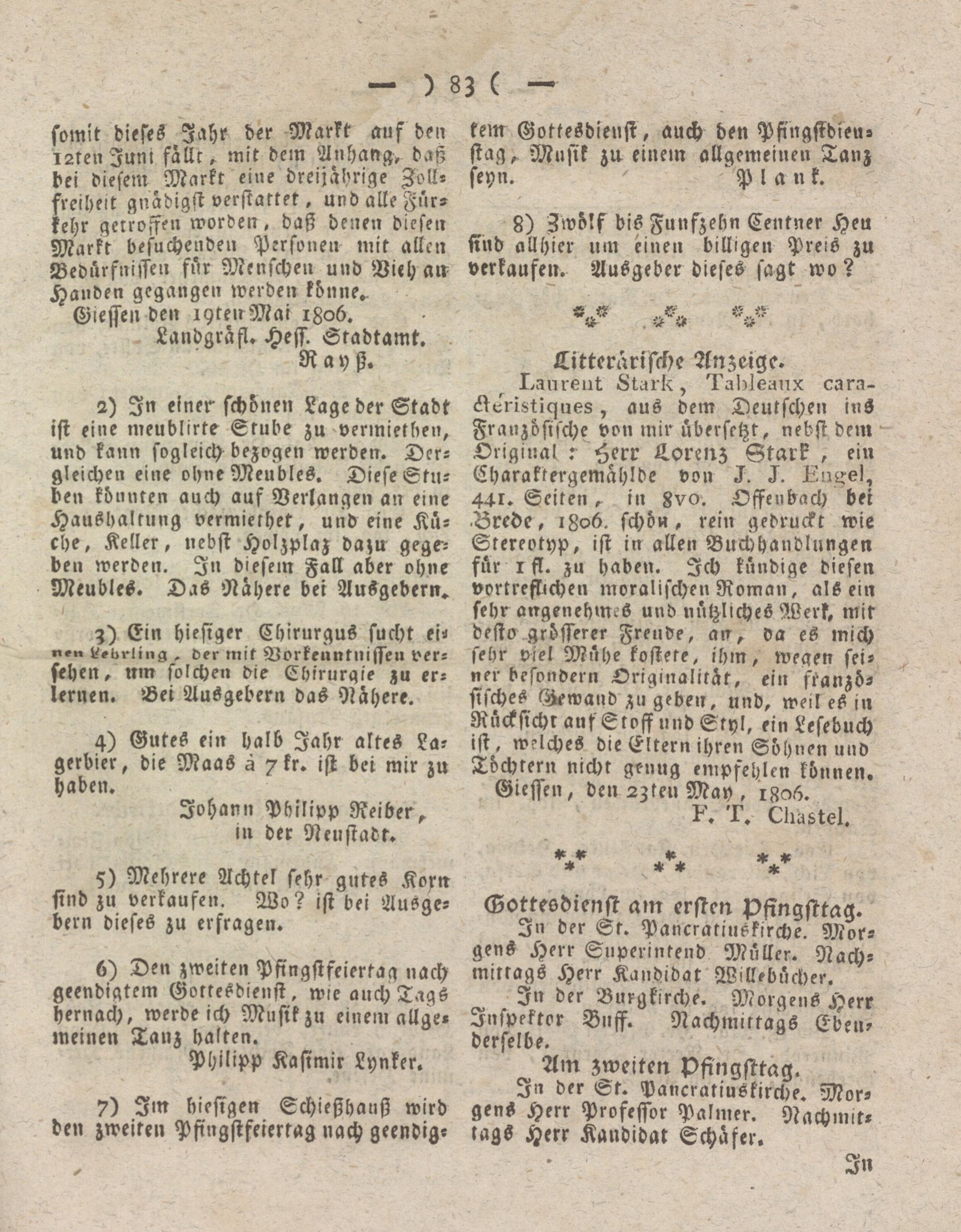 Laurent Stark, Tableaux cara- dteristiques, aus dem Deutschen ins Französische von mir übersetzt, nebst dem Original: Herr Lorenz Stark, ein Charaktergemahlde von J. J. Engel, 441. Seiten r in gvo. Offenbach bei Brede, 1806. schön, rein gedruckt wie Stereotyp, ist in allen Buchhandlungen für 1 st. zu Haden. Ich kündige diesen vvrtresiichen moralischen Roman, als ein sehr angenehm.s und nützliches Werk, mit desto grösserer Freude, an, va es mich sehr viel Mühe kostete, ihm, wegen seiner besondern Originalität, ein französisches (bewand zu geben, und, weil es in Rücksicht auf Stoff und Styl, ein Lesebuch ist, welches die Eltern ihren Söhnen und Töchtern nicht genug empfehlen können.