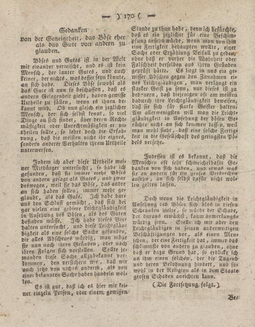 Doch wenn die Leichtgläubigkeit in Ansehung des Bösen sich blos in diesen Schranken hielte, so würde der Schade, der daraus erwächst, kaum anmerkuugs- würdig seyn. Stelle ich mir aber den Leichtgläubigen in seinen anderweitigen Beschäftigungen vor, als einen Men, sehen, der eine Fertigkeit hat, immer das schlimmste von andern zu glauben, ohne daß er dazu Grund hat, so erblicke ich an ihm einen solchen, der die Tugend und deren Belohnung hindert, und sowohl in der Religion als in dem Staate groftn Schaden anrichten kann.