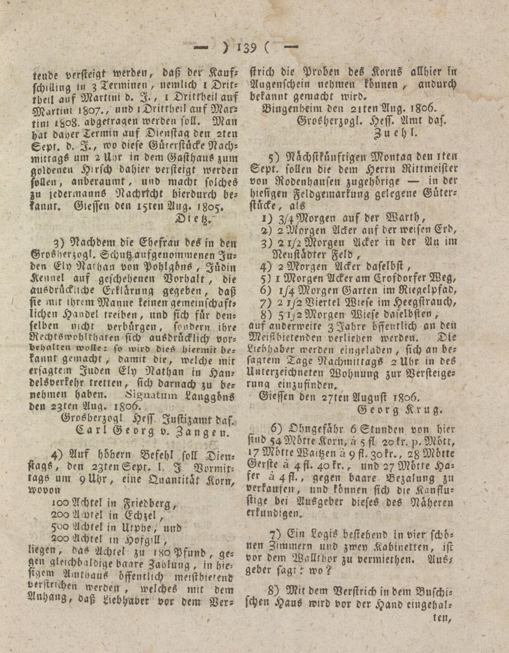 3) Nachdem die Ehefrau des in den Grosherzogl. Schutz aufgenommenen Inden Ely Nathan von Pvhlgöns, Jüdin Kennel auf geschehenen Vorhalt, die ausdrückliche Erklärung gegeben, daß sie Mit lhrcm Manne keinen gemeinschaft, liehen Handel treiben, und sich für denselben nicht verbürgen, sondern ihre RechtSwohlrharen sich ausdrücklich vor- behalren wolle: so wird dieS biermtr bekannt gemacht, damit die, welche mit erfaßtem Juden Ely Nathan in Handelsverkehr treuen, sich darnach zu benehmen haben. Signatum Langgöns den szten Aug. i§o6.