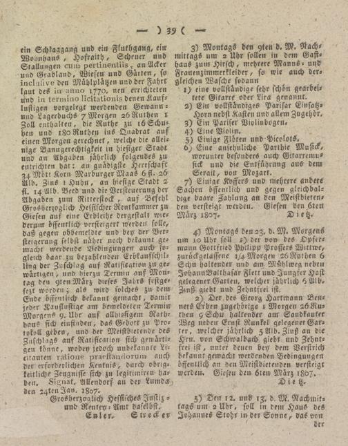 7) Einige Koffers und mehrere anders Sachen öffentlich und gegen gleichdal- dige baare Zahlung att den Meistbietenden versteigt werden. Giesen den 6tctt Marz 1807. Dietz,