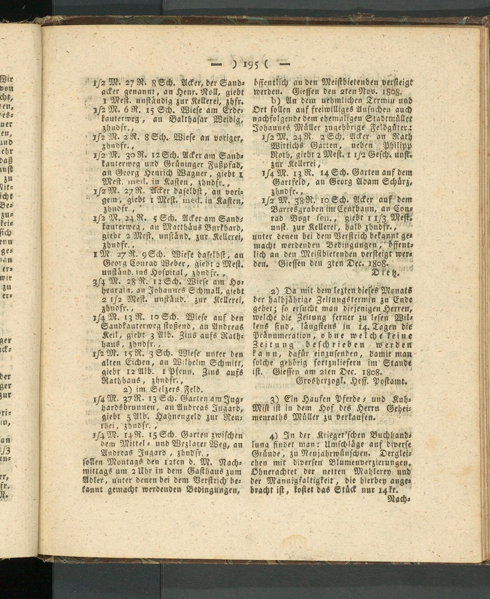 1/2 M. g89t. io Sch. Acker auf dem Barresgraben im Centbann, an Conrad Vogt fen., giebt 1 1/3 Mest. unst. zur Kellerei, halb zhndfr., unter denen bei dem Verstrich bekannt gemacht werdenden Bedingungen,' öffentlich an den Meistbietenden versteigt werden. Giessen den gten Dec. 1808.