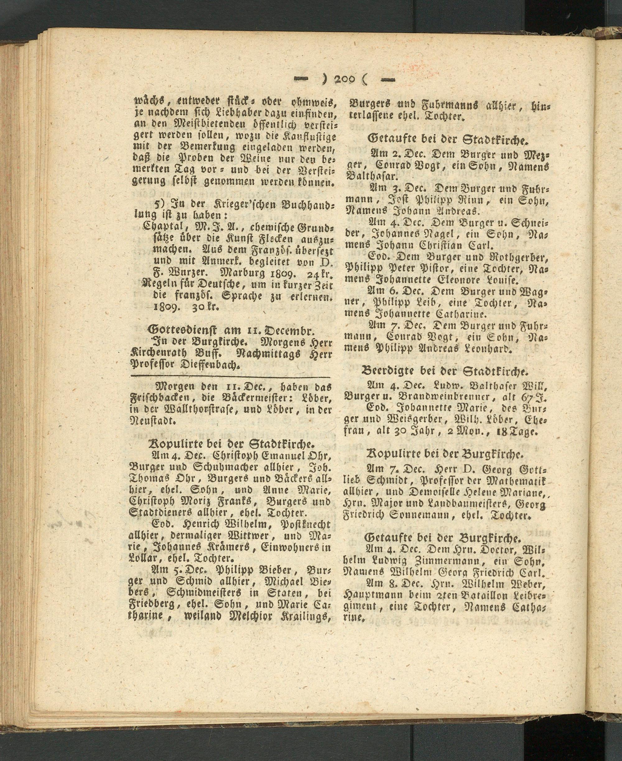 Am 4. Dec. Christoph Emanuel Ohr, Burger und Schuhmacher allhier, Joh. Thomas Ohr, Burgers und Backers allhier, ehel. Sohn, und Anne Marie, Christoph Moriz Franks, Bürgers und Ctadtdieners allhier, ehel. Tochter.