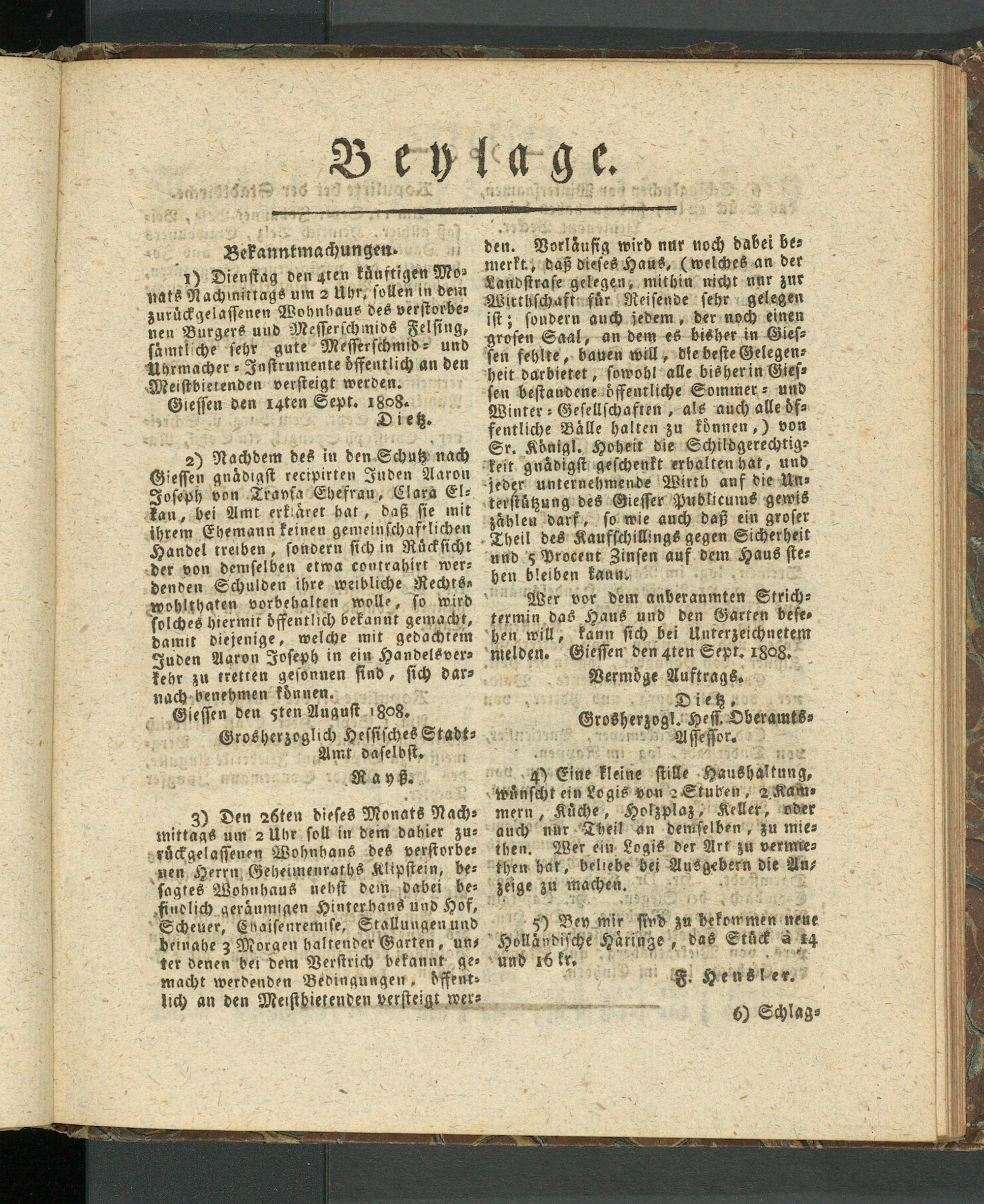 Wer vor dem anberanmten Strichtermin das Hans und den Garten besehen will, kann sich bei Unterzeichnetem melden. Giessen den 4ten Sept. 1808.