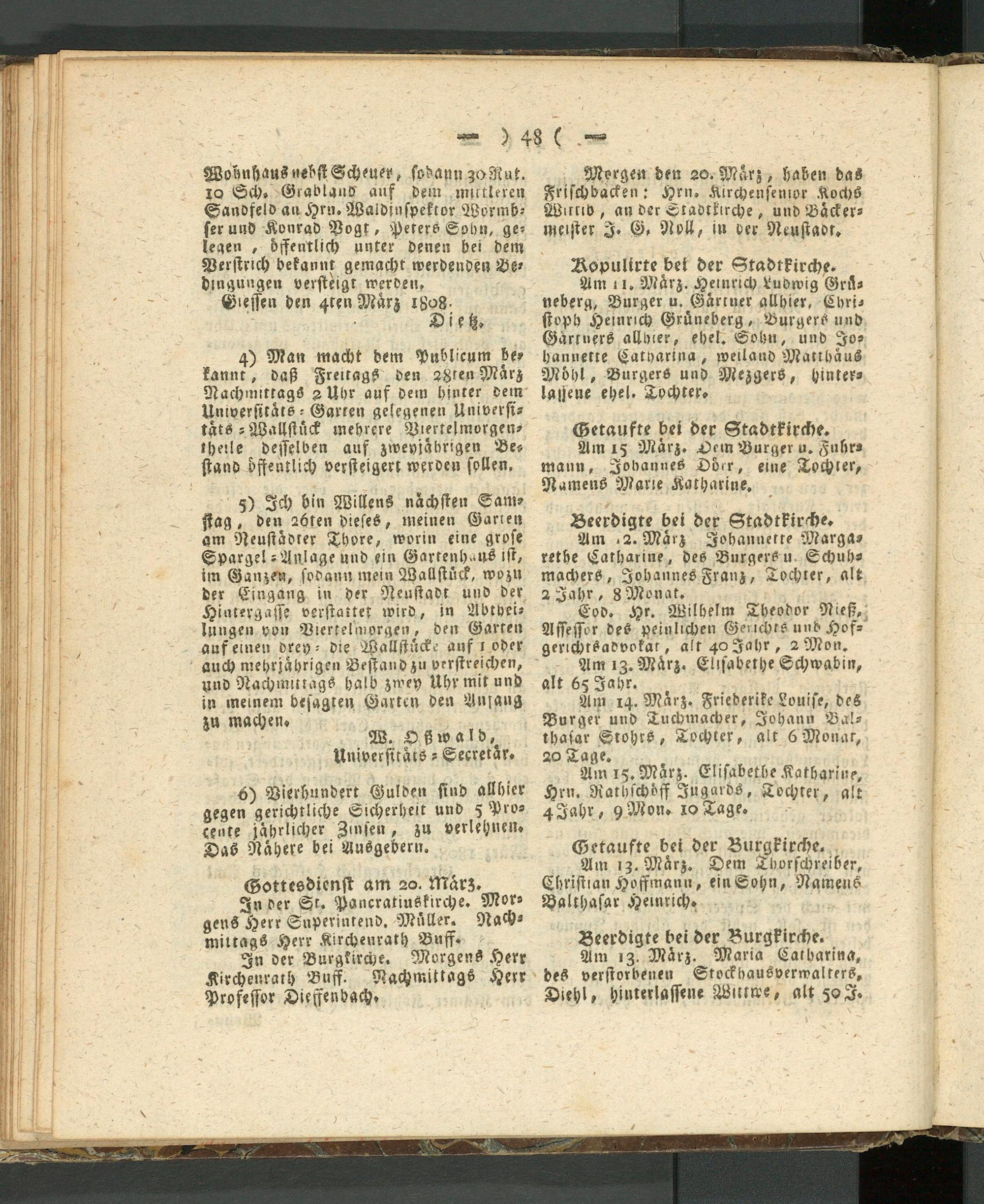 4) Man macht dem publicum be- kannt, daß Freitags den s8ten März Nachmittags sUhr auf dem hinter dem Universttats - Garten gelegenen Universi- tätS-Wallstnck mehrere Piertelmorgen- theile desselben auf zweyjäbrigen Bestand öffentlich versteigert werden sollen,