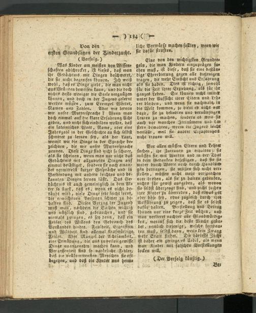 Eine von den wichtigsten Grundregeln, die man Kindern ciuzuprägen suchen muß, «st diese, daß sie eine bestän, dige Ehrerbietung gegen alle diejenigen tragen, die mehr Einsicht uuO Erfahrung «IS sie haben. Dies ist richtig, sowohl für die Zeit ihrer Erziehung, als für ihr ganzes Leben. Sie können nicht immer unter der Aufsicht ihrer Eltern und Lehrer bleiben, und wenn sie nachmals in die Welt kommen, |u dient es nicht nur dazu, sie zu beliebten und vernünftigen Leuten zu machen, sondern es wird sie auch vor manchen Jrrtyümern und Lastern bewahren, worin die Jugend leicht verfallt, weil sie andrer Eifayrenhetk nicht traue» will.