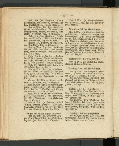 Am iz.Mai. Die Hrn. Kaufleute, Phigus, Kulp und Crai, von Heidelberg, Srein und Neffen, von Frankfurt, log. in der Post.